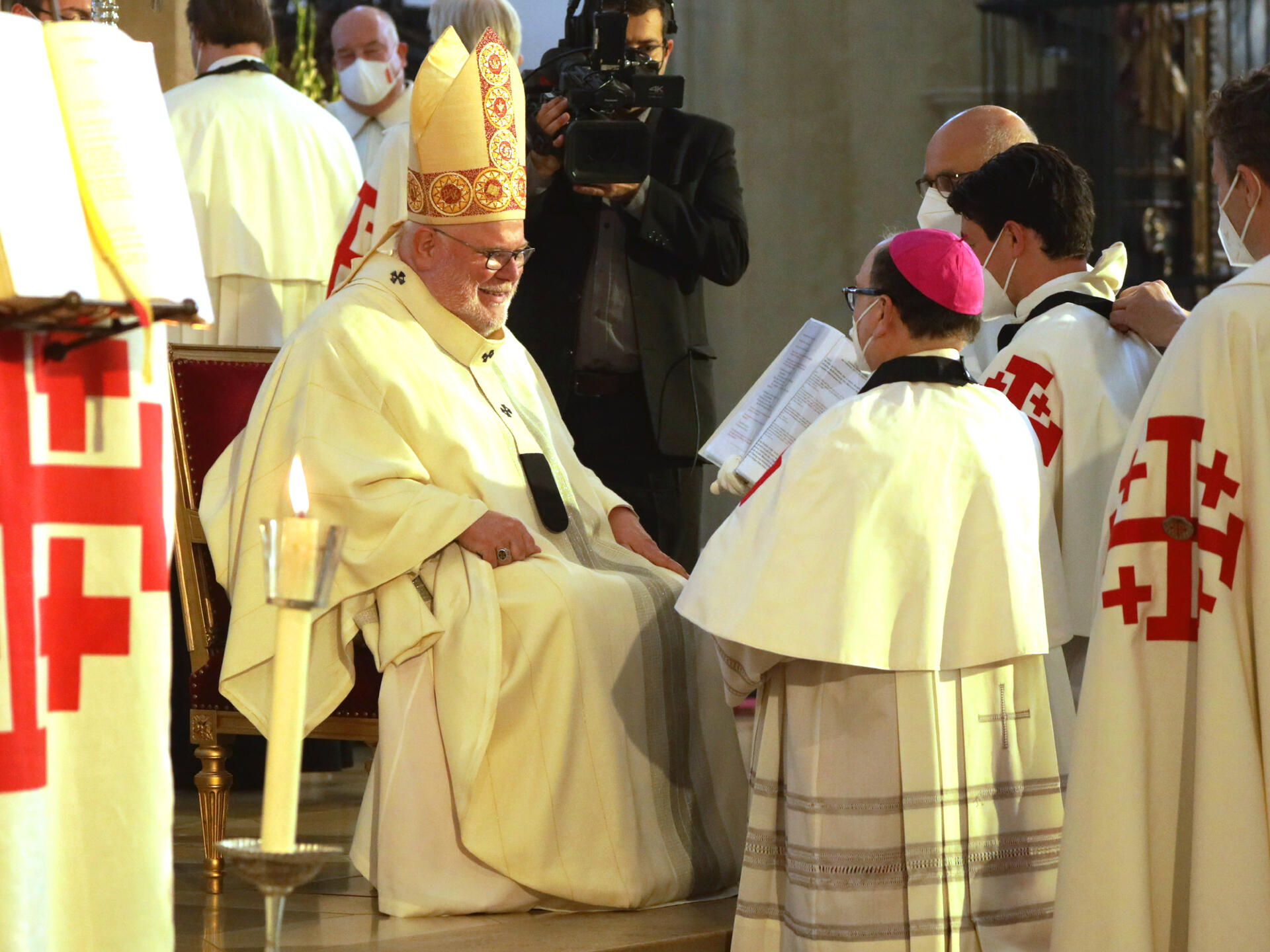 Augsburg (pba). Im Rahmen der Herbstinvestitur des päpstlichen Ritterordens vom Heiligen Grab zu Jerusalem sind am Samstag in Augsburg 26 Frauen und Männer in den Ritterorden aufgenommen worden - unter ihnen auch Bischof Dr. Bertram Meier. Großprior Reinhard Kardinal Marx überreichte ihm in der Basilika Sankt Ulrich und Afra Ordensmantel und Ordenskreuz. Als Augsburger Oberhirte wurde Bischof Bertram sogleich der Titel "Großoffizier (Komtur) mit Stern" zuerkannt. Die Festlichkeiten zur Investitur fanden am Sonntag mit einem Pontifikalamt im Augsburger Dom ihren Abschluss. EWTN übertrug live.