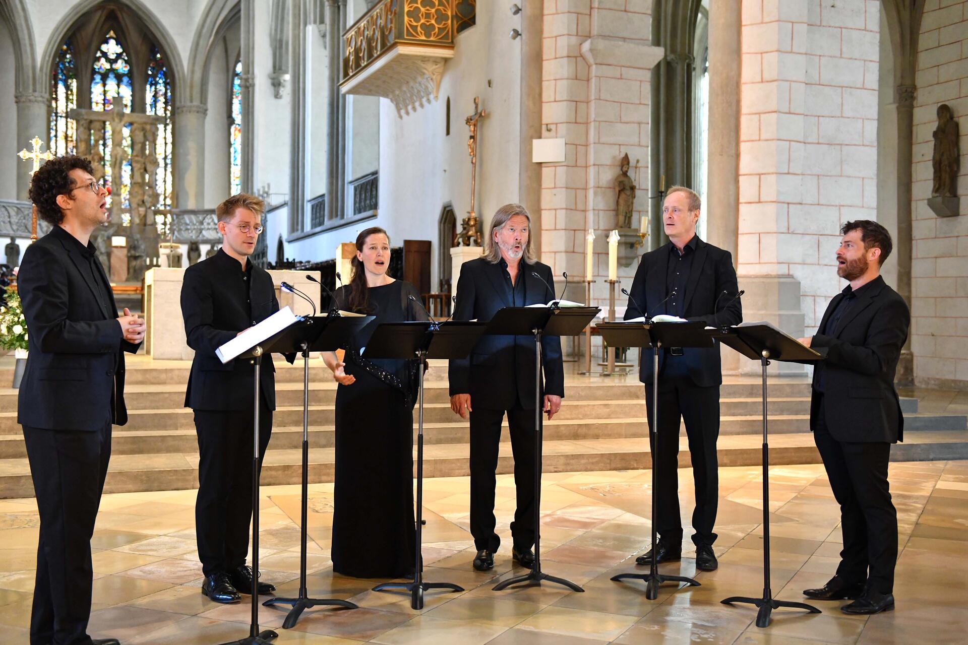 Es ist Punkt 15.25 Uhr, als sich das sechsköpfige Vokalensemble AUXantiqua unter der Leitung von Domkapellmeister Stefan Steinemann vor den Altarstufen des Augsburger Doms aufstellt und die ersten von 500 Minuten in ein vielstimmiges Klangerlebnis verwandeln. Ein mehrstündiger Musik-Marathon begann, zu dem die Dommusik anlässlich des 500. Geburtstags von Giovanni Pierluigi da Palestrina (1525–1594) eingeladen hatte, und die eine eindrucksvolle Hommage an den großen Renaissance-Meister werden sollte.