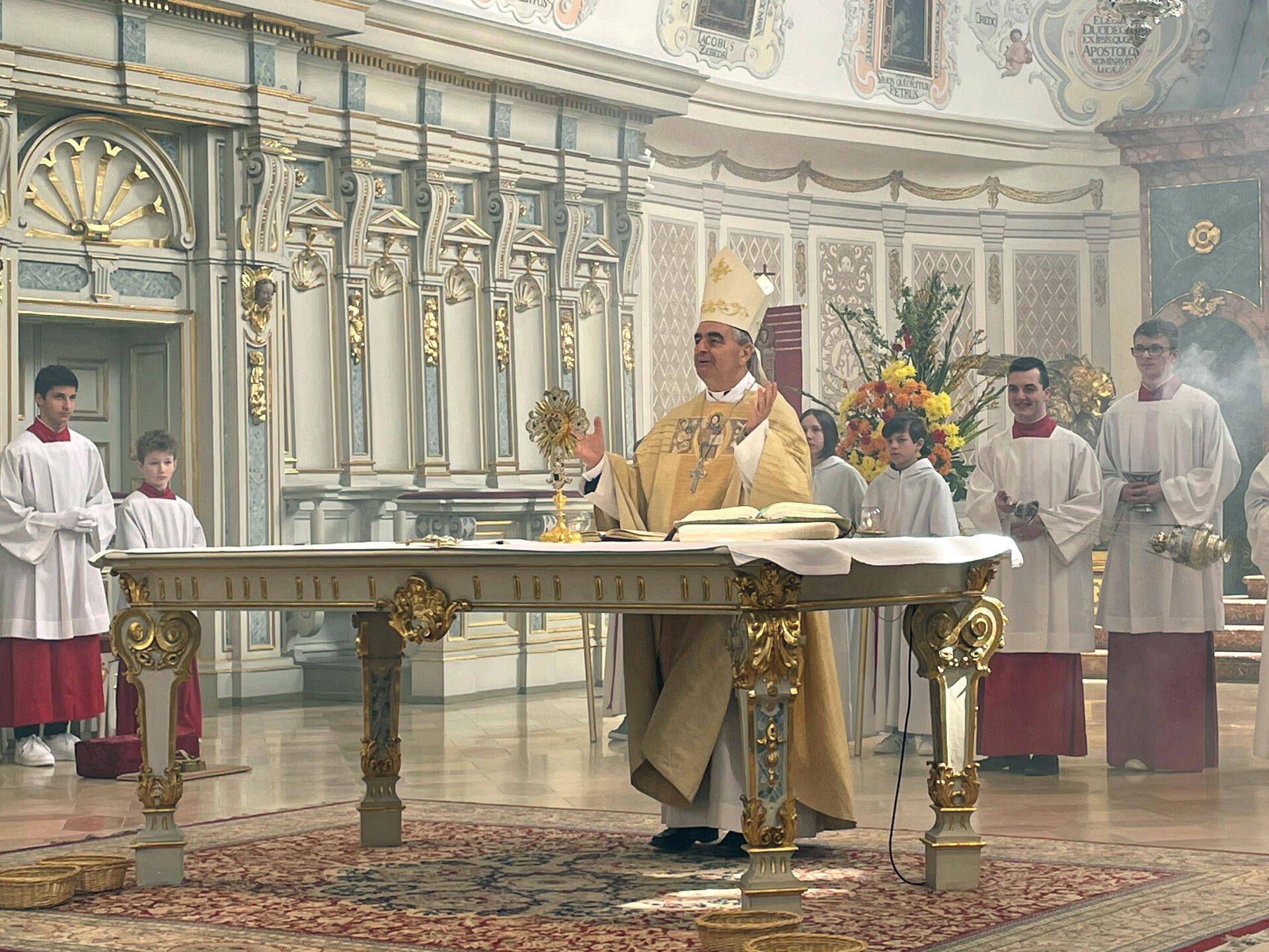 Zum Abschluss seines Besuchs feierte Erzbischof Eterovic ein feierliches Pontifikalamt in der Basilika St. Peter. Dabei sang die Cappella Cantabile unter der Leitung von Dr. Axel Flierl die „Cantus Missae“-Messe von Joseph Gabriel Rheinberger so wie das „Ecce sacerdos magnus“ von Anton Bruckner. Der Apostolische Nuntius bestärkte in seiner Predigt die Mitfeiernden, die Auferstehung Jesu Christi als Mittelpunkt des christlichen Glaubens anzunehmen und und dem Auferstandenen im Wort Gottes, in den Sakramenten, dabei vor allem im Bußsakrament, und in tätiger Nächstenliebe zu begegnen.