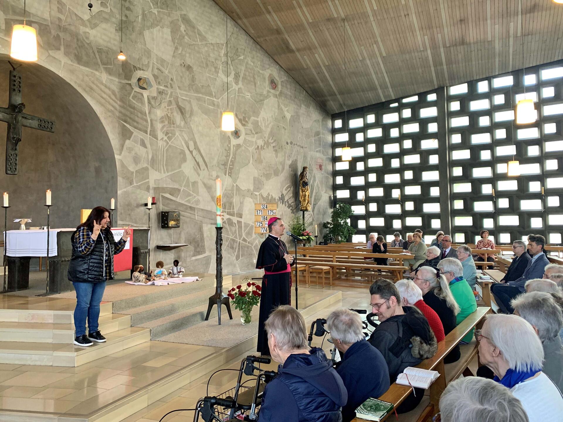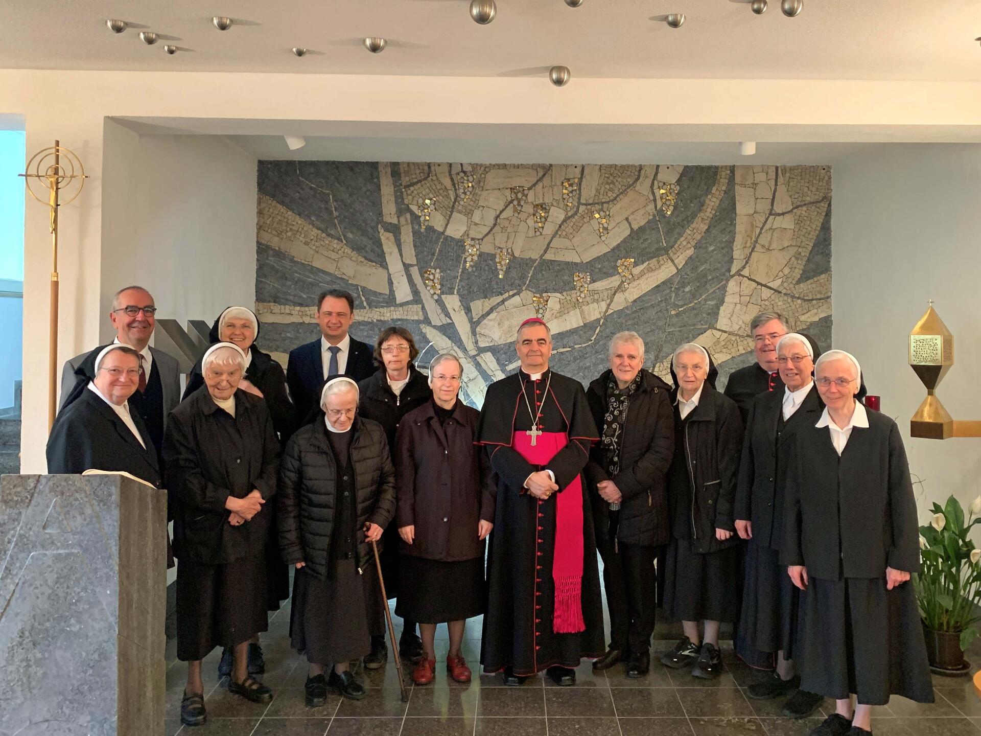 Da Dillingen auch eine Stadt der Caritas ist, stand am Sonntagmorgen als erster Programmpunkt ein Besuch in der Christkönigskirche der Regens-Wagner-Stiftung an. Dort wurde der Nuntius von Direktor Rainer Remmele und den Dillinger Franziskanerinnen empfangen und über Aufgaben und Zielsetzung der Stiftung informiert. Der Nuntius betete am Grab von Regens Wagner und erteilte den Schwestern und allen Gläubigen, die in der Christkönigskirche versammelt war, den Apostolischen Segen.