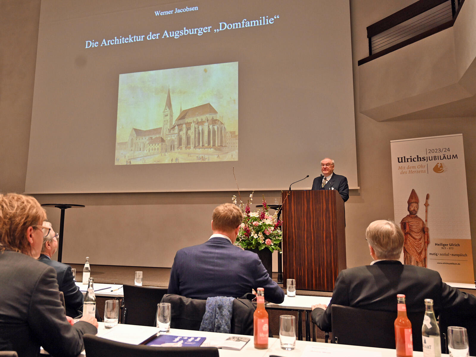 Um die Jahrtausendwende herum erlebte das christlichen Abendland einen regelrechten Bauboom. Auch in Augsburg setzte im 10. Jahrhundert, also während der Regierungszeit Bischof Ulrichs, eine verstärkte Bautätigkeit ein. Professor Bernd Schneidmüller stellte deshalb im Rahmen seines Eröffnungsvortrages die Entfaltung der Augsburger Kirchenlandschaft in einen größeren Kontext und ordnete diese in die Epoche des ottonischen Jahrhunderts ein. So seien Bischofsstädte in dieser Zeit oft sehr ähnlich aufgebaut. Er erinnerte auch daran, dass der Bauboom im Gegensatz zu der bitteren Not der Bevölkerung gestanden habe.