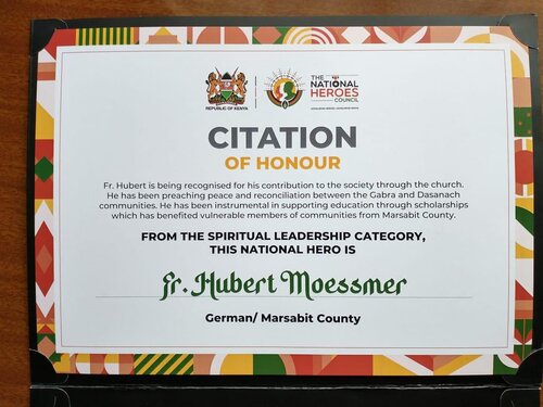 Der Augsburger Priester Hubert Mößmer lebt bereits seit vielen Jahren im ländlichen Nordosten Kenias, wo er sich für die dortigen Menschen einsetzt sowie sich als Mittler zwischen verfeindeten Bevölkerungsgruppen engagiert. Für sein Wirken wurde er jetzt von Präsident William Ruto zum "Nationalheld" des westafrikanischen Landes ernannt. Mit diesem Titel werden jährlich Personen geehrt, die sich in besonderer Weise für Kenia einsetzen