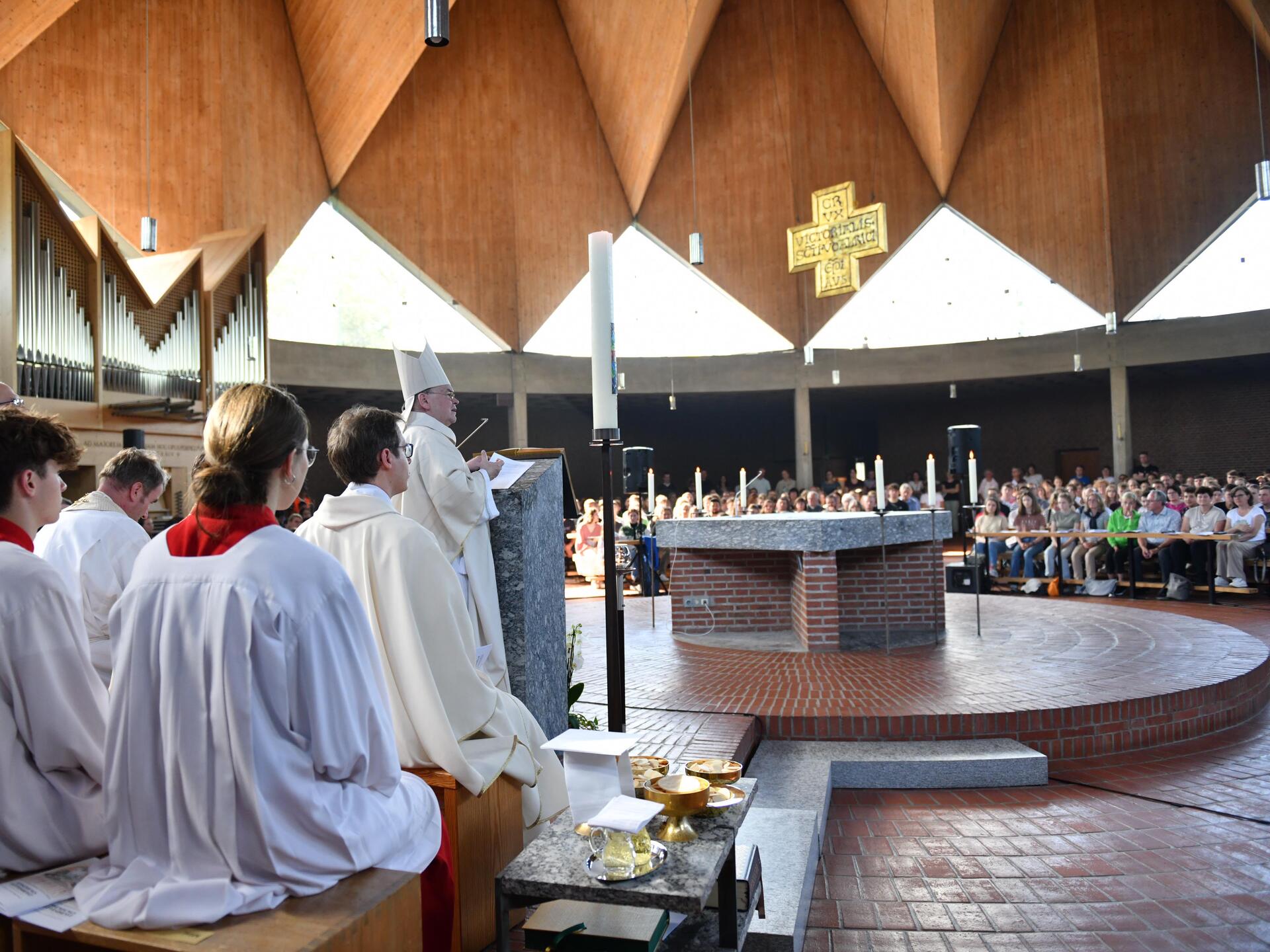 Augsburg (pba). In Vorbereitung auf die internationale Ministranten-Romwallfahrt vom 28. Juli bis 3. August haben sich an diesem Sonntag rund 1.000 Ministrantinnen und Ministranten aus dem ganzen Bistum Augsburg von Bischof Dr. Bertram Meier aussenden lassen. In einem feierlich, beschwingten Gottesdienst in der Kirche Zu den Heiligen Engeln in Landsberg sprach er den Mädchen und Jungen seine Dankbarkeit und Freude über die bald beginnende Wallfahrt und Größe der diözesanen Reisegruppe aus. Insgesamt werden rund 3.000 Kinder und Jugendliche aus dem Bistum Augsburg bei den Begegnungstagen in Rom dabei sein.