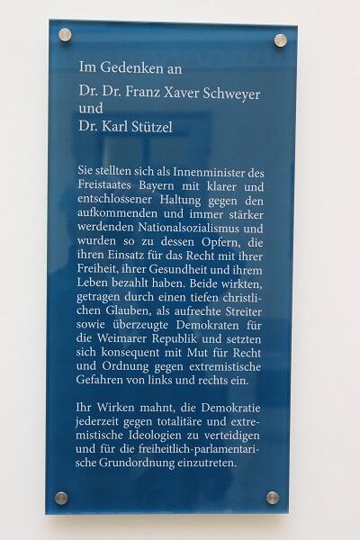 Das Ministerium ehrt beide früheren Minister nun mit einer Gedenktafel, auf der der "tiefe christliche Glaube" betont wird, der Schweyer und Stützel trug; diese wurde im Ehrengang des Innenministeriums angebracht.