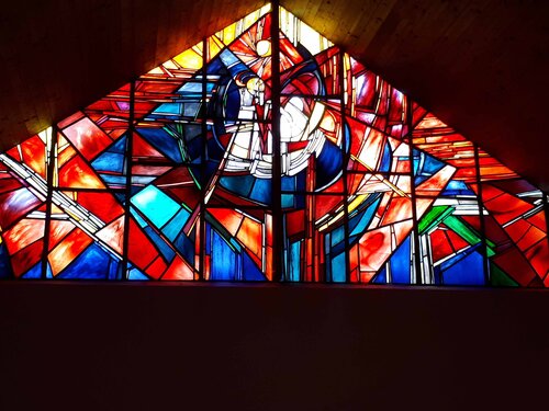 Keimzelle des künstlerischen Ensembles in Eggisried ist die Hauskapelle, von Erich Schickling selbst mit zwei leuchtenden Glasfenstern ausgestattet. Eines davon zeigt Szenen der biblischen Heilsgeschichte, von Noahs Arche über die Erzväter und Propheten bis zu König David, dem Stammvater Jesu, in einer Achse mit dem hoch über ihm aufragenden Kreuzesbaum. Der Auferstehung ist das zweite, sogenannte Osterfenster gewidmet, in kraftvollen Rot- und Blautönen, die mit dem erhöhten Herrn der kreisenden Sonne entgegenstreben. Dieses „Urlicht“, das der Erde Leben spendet, gehörte zu den Lieblingsmotiven des gläubigen Künstlers und begegnet dem Besucher immer wieder in neuen Variationen.