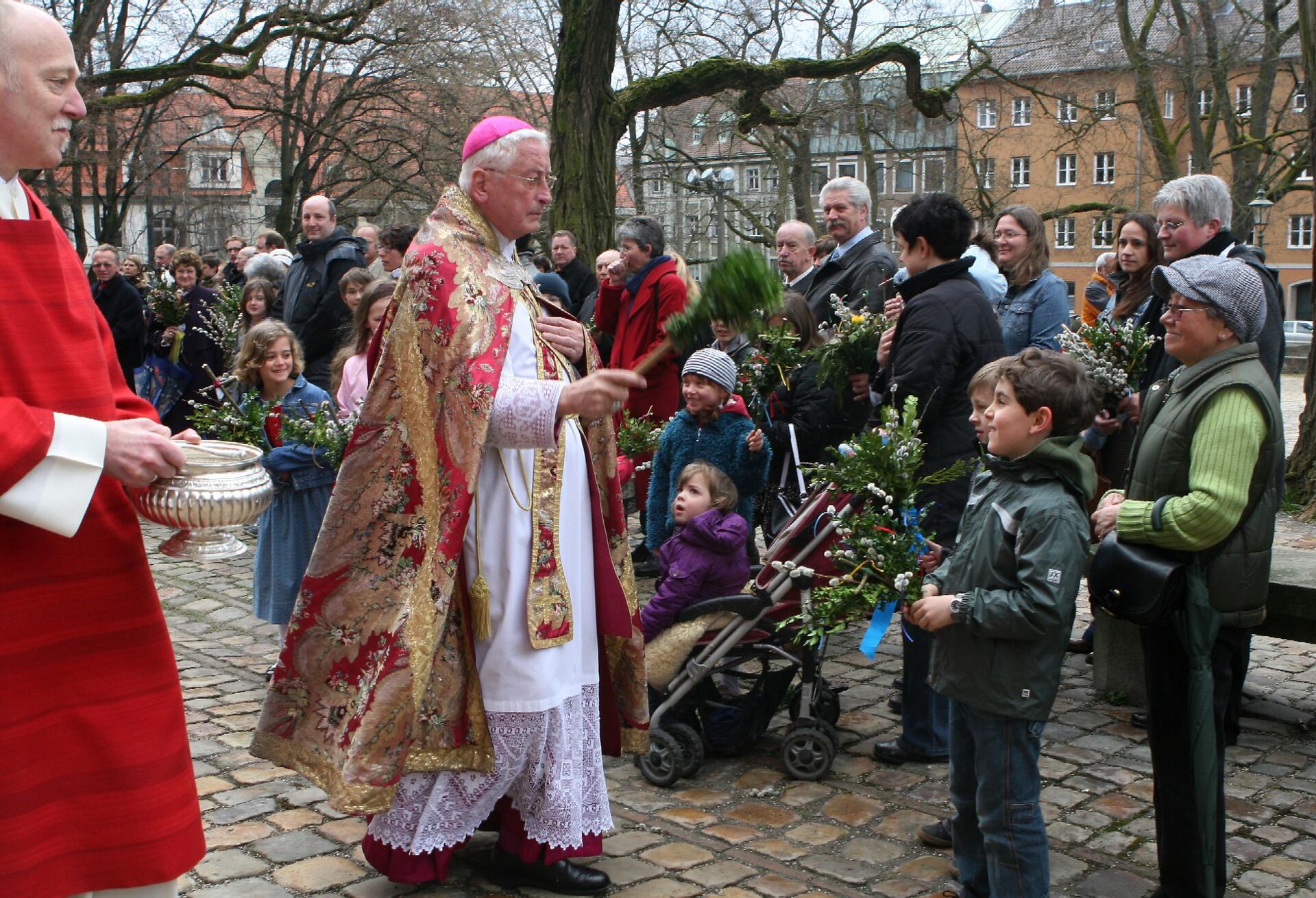 An dem Pontifikalamt zu Palmsonntag nahmen die Augsburger Weihbischöfe Josef Grünwald und Dr. Dr. Anton Losinger sowie weitere Vertreter des Domkapitels teil. Zuvor segnete Bischof Mixa entsprechend der Tradition Palmzweige vor dem Dom. Mit den geweihten Zweigen zog die Gemeinde sodann in einer Prozession durch den Fronhof in den Mariendom ein.