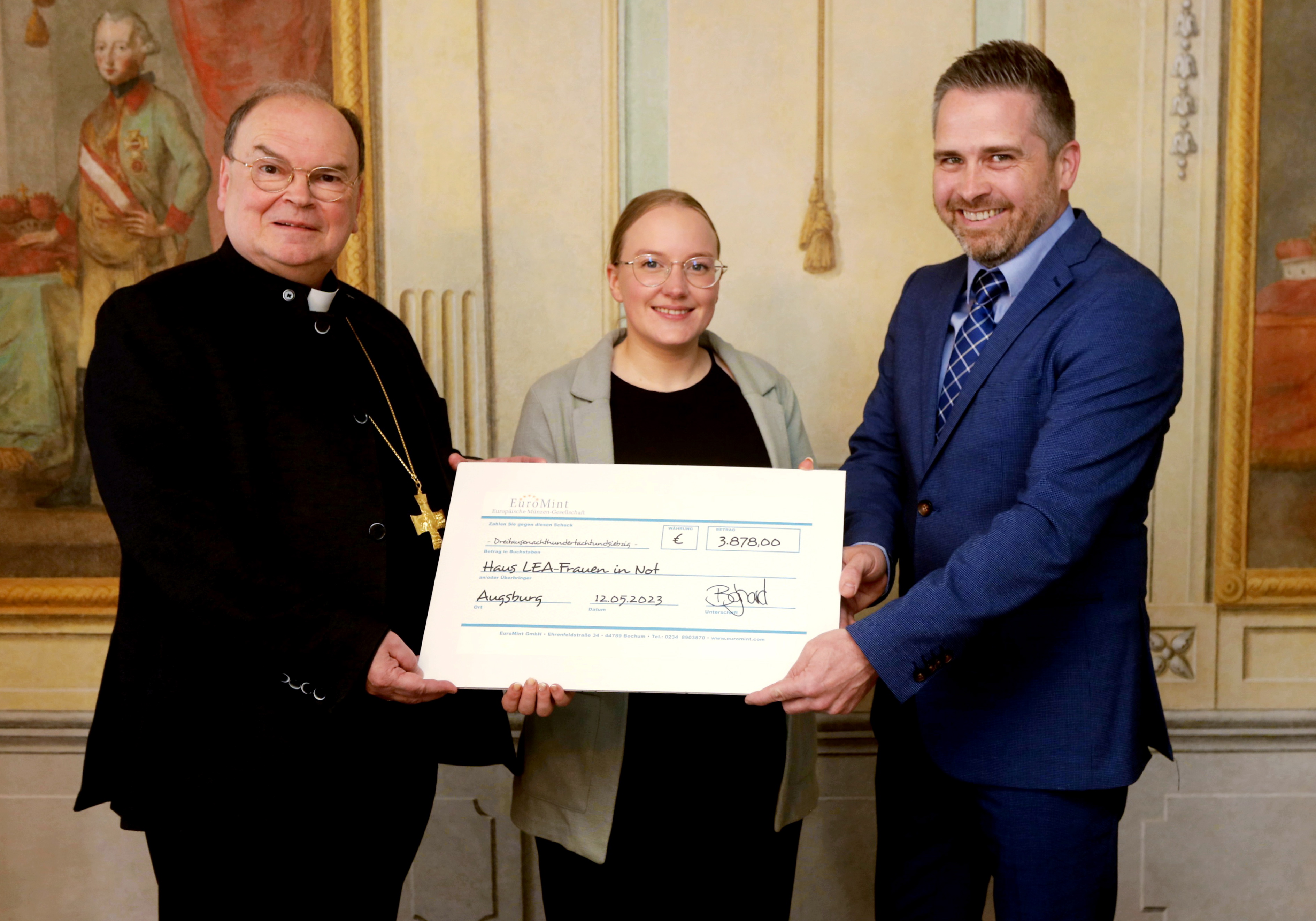 Schon zur Bischofsweihe vor drei Jahren hatte die Firma EuroMint, die jetzt auch die Ulrichsmedaille gestaltet hat, eine Sonderprägung herausgegeben. Zehn Prozent des Verkaufserlöses daraus, genau EUR 3.878,00, wurden nun in Augsburg als Spende an die Wohn- und Begegnungsstätte für Frauen in Not „LEA“ übergeben. „LEA“, benannt nach der Ordensschwester Lea Ackermann, ist eine ambulante Einrichtung des Caritasverbandes für die Stadt und den Landkreis Augsburg e.V., in der Frauen in Not, Armut oder Obdachlosigkeit Zuflucht finden. Deren Leiterin Anna Wirth zeigte sich überaus dankbar für den Geldsegen: „Fast 4.000 Euro für Frauen in Not sind unfassbar viel Geld. Besonders freuen wir uns auch darüber, dass damit die Sichtbarkeit von Frauen in Not größer werden wird.“