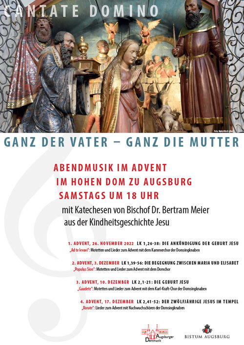 Augsburg (pba). Gesprochenes und gesungenes geistliches Wort prägen in dieser Adventszeit wieder die Konzertreihe „Cantate Domino“ im Hohen Dom zu Augsburg. Umrahmt von adventlichen Motetten und Liedern der Augsburger Dommusik hält Bischof Dr. Bertram Meier am Vorabend der vier Adventssonntage jeweils eine Katechese zur Kindheit Jesu. Zum 3. Advent geht es in der Katechese des Bischofs um die Geburt Jesu.