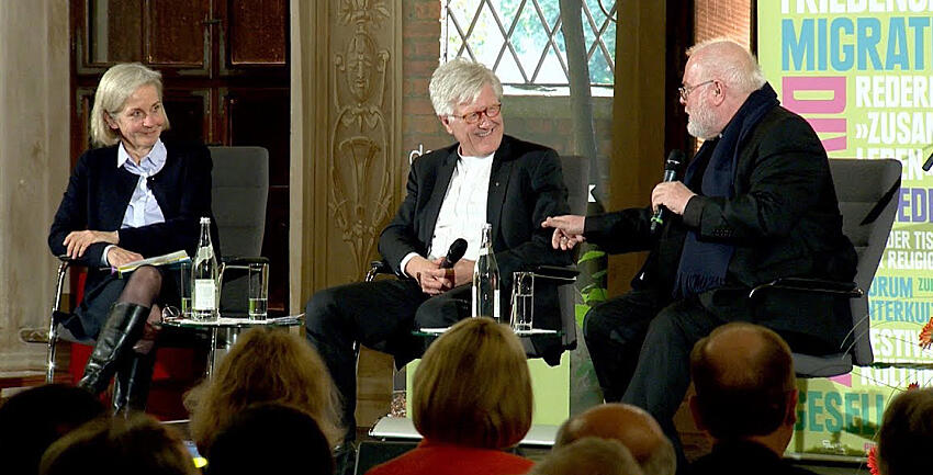 (katholisch1.tv) Braucht der Frieden die Kirchen? Und wie geht es weiter mit der Kirche als Institution? Um diese Fragen ging es bei den Augsburger Friedensgesprächen: Der Vorsitzende der Deutschen Bischofskonferenz, Kardinal Reinhard Marx und der Ratsvorsitzende der evangelischen Kirche in Deutschland, Landesbischof Heinrich Bedford-Strohm, haben sich im vollbesetzten Goldenen Saal der Stadt Augsburg um Antworten bemüht. Beide Männer, das wurde an diesem Abend deutlich, sehen optimistisch in die Zukunft und gehen gleichzeitig davon aus, dass sich die Kirchen mit grundlegenden Veränderungen auseinandersetzen müssen. Katholisch1.tv zeigt Ihnen Ausschnitte aus diesem Gespräch.