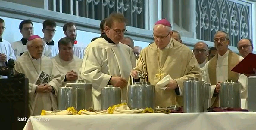 So manche Touristen, die am vergangenen Mittwoch am Vormittag mit Ihren Fotoapparaten den Augsburger Dom aufsuchten, um ein paar Erinnerungsfotos zu schießen, staunten nicht schlecht, als sie drinnen waren – die Kathedrale: vollbesetzt, die Domsingknaben: auf Hochtouren, und die Atmosphäre: sehr, sehr feierlich. Dieser Mittwoch vor Ostern ist in der Diözese Augsburg einer ganz besonderen Messe gewidmet – der Chrisammesse.