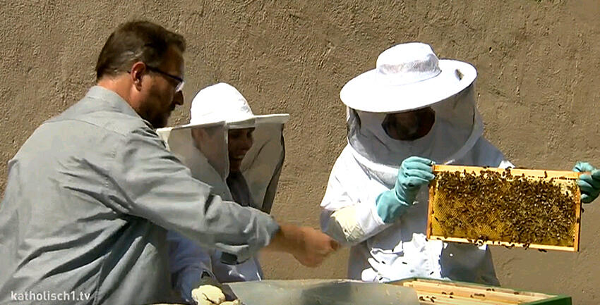 (katholisch1.tv) Rettet die Bienen: Das Volksbegehren im Frühling hat die Menschen auf die Straßen gebracht. Es war wohl ein Thema, das in der Luft lag. Schon vor dem Volksbegehren hatte ein Pfarrer in Augsburg die Idee, er könne auf dem Gelände seiner Pfarrkirche doch Bienen einen Heimat geben. Schließlich sind Umweltschutz und das Bewahren der Schöpfung ganz ähnliche Anliegen. Wir haben die Pfarreiengemeinschaft Augsburg-Oberhausen-Bärenkeller besucht und bei St. Peter und Paul zwei Bienenstöcke gefunden.