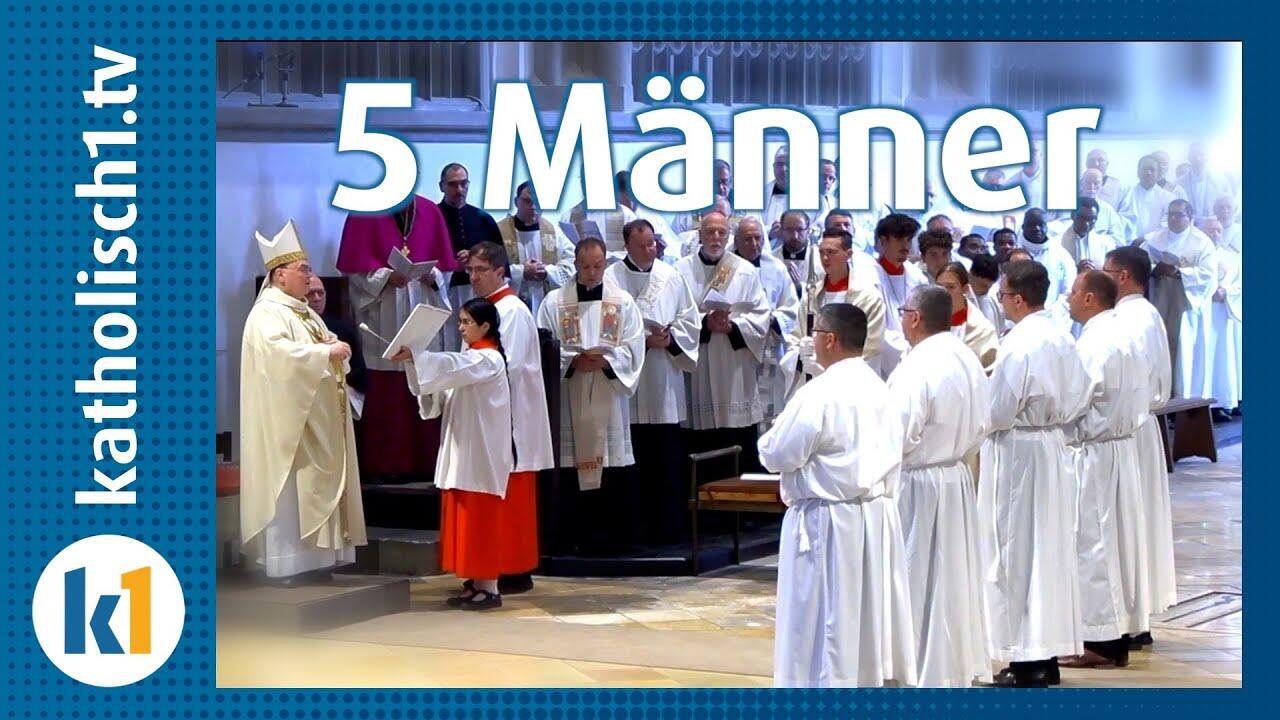 (katholisch1.tv) Michael Bauer (Haldenwang), Pierre D‘Antino (Bayerniederhofen), Karsten Köhler (Betzigau), Christian Schweizer (Augsburg-Pfersee) und Stephan Weiß (Zell) sind jetzt Ständige Diakone. Bei ihrer Weihe im Augsburger Dom standen vor allem auch die Ehefrauen an ihrer Seite.