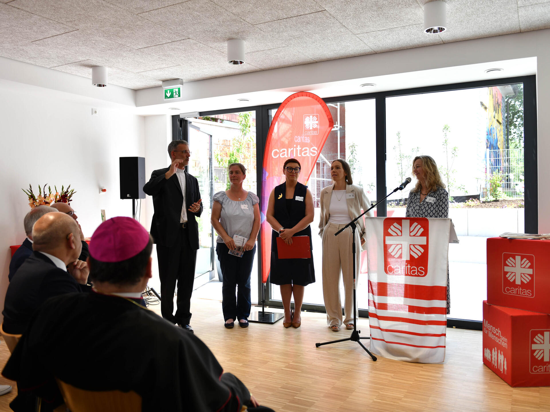 Im Anschluss an die Segnung des Hauses durch Bischof Dr. Bertram Meier stellten die Bereichsleiterinnen der drei Einrichtungen ihre Arbeit näher vor. Eine Besichtigung der Räumlichkeiten war danach möglich. Auch im Rahmen des Stadtfestes am kommenden Sonntag lädt das Haus zur „Tag der offenen Tür“ ein.