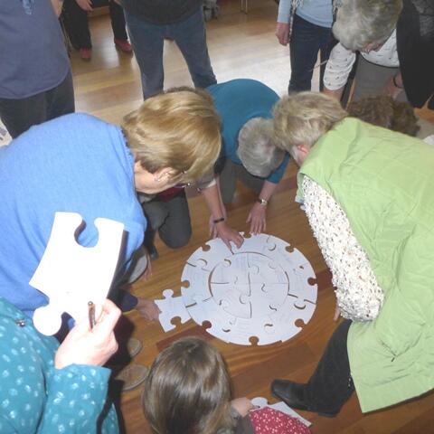 Mit einer praktischen Paarübung zum „Zuhören“ tauschten sich die Teilnehmer dann über ihre Motivationen für die weltkirchliche Arbeit aus. Ein Puzzle, das in den Misereor-Materialien für die Pfarreiarbeit angeboten ist, bildete den thematischen Schlusspunkt der Einführungstagung. Darauf notierten die Frauen und Männer aus den Pfarreien und Gruppen was für sie persönlich „gutes Leben“ bedeute. Zusammen mit Anton Stegmair von der Abteilung Mission-Entwicklung-Frieden brachten sie am Ende der Tagung in einer kurzen Andacht die Gedanken und Wünsche des Tages vor Gott.
