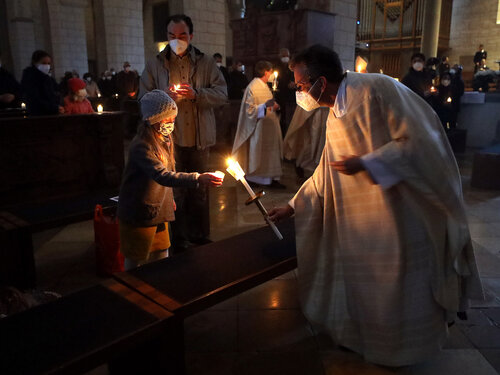 Auf der anderen Seite seien uns die Frauen mit ihren Ängsten aber auch wieder sehr nahe: „Lastet nicht auch auf uns die Sorge jenes schweren Steines, hinter dem alle Hoffnung begraben liegt?“ Die Wundmale unseres Lebens seien auch die Wunden des Karfreitags, der Nacht der Welt und in unserem Herzen. So wie das Licht der Osterkerze für sich allein das Dunkel des Domes nicht ganz ausleuchten könne, gehe auch die Nacht weiter – „doch sie ist verklärt. In ihr leuchtet die kleine Flamme von Ostern. Und dieses kleine Licht hat mehr recht als die große Dunkelheit!“, betonte der Bischof.