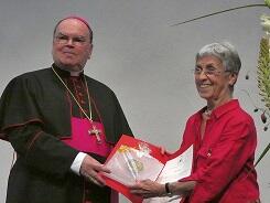 Die Laudatio auf Edeltraud Wohlfarth begann Bischof Bertram mit der Würdigung ihrer Mitwirkung im Diözesanrat der Katholiken von 1982 bis 1994. In dieser Zeit arbeitete sie als von Bischof Stimpfle hinzuberufenes Mitglied auch aktiv in der Vorstandschaft mit. Als Mutter von drei Kindern lag ihr, wie Bischof Bertram herausstellte, insbesondere das Thema Familie am Herzen. Daher wirkte sie im Sachausschuss „Ehe und Familie“ mit und war zeitweise dessen Leiterin. Neben ihrem Engagement in der Betreuung der Spätaussiedler seit Anfang der 90er Jahre würdigte Bischof Bertram insbesondere die Verdienste von Frau Wohlfarth um die Schulpartnerschaft mit der tschechischen Diözese Königgrätz: „Seit mehr als 30 Jahren werden die dortigen kirchlichen Schulen durch das vom Diözesanrat getragene Schulhilfswerk unterstützt, dessen Gründung maßgeblich auf ihre Initiative zurückgeht. Bis heute organisiert und begleitet Edeltraud Wohlfarth mit großem Elan den Schüleraustausch und die alljährlichen Auftritte des Schulchores des bischöflichen Gymnasiums Königgrätz in unserem Bistum.“ Abschließend stellte er in seiner Lobrede die engagierte Augsburgerin als „ein leuchtendes Beispiel für grenzüberschreitenden Dialog und Völkerverständigung“ heraus und schloss mit dem Wunsch: „Möge ihr Vorbild ausstrahlen und viele dazu anspornen, selbst Aktionen und Begegnungen dieser Art zu initiieren!“