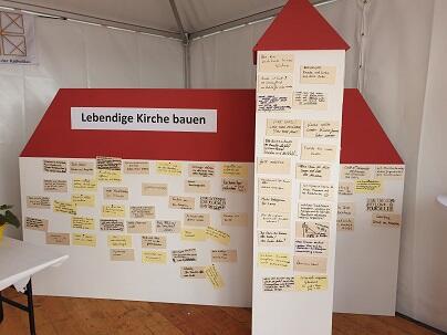 Die Äußerungen und Vorstellungen für eine lebendige Kirche waren breit gefächert und vielfältig. Darunter sind durchaus die „klassischen“ Themen wie die Einführung des Frauenpriestertums und die Abschaffung des Zölibates. Darüber hinaus wünschen sich viele eine offene und vielfältige, eine zeitgemäße und einladende, eine lockere und weniger bürokratische Kirche, die rausgeht und über den eigenen Kirchturm schaut, die die Vielfalt an Begabungen als Chance schätzt und nicht als Bedrohung fürchtet. Kirche ist dann eine lebendige Kirche, so weitere Rückmeldungen und Äußerungen auf dem Kirchenmodell, wenn sie nah bei den Leuten und bei Gott ist, wenn sie hinhört und hinschaut auf die Nöte und Fragen der Menschen. Weitergehend stechen die Bausteine zur Kirche als Gemeinschaft heraus. So soll die Kirche eine ehrliche und sich gegenseitig stützende Gemeinschaft sein, die sich durch mehr Mitbestimmung auszeichnet und die ihren Ausdruck in einer zeitgemäßen Gestaltung der Gottesdienste findet.