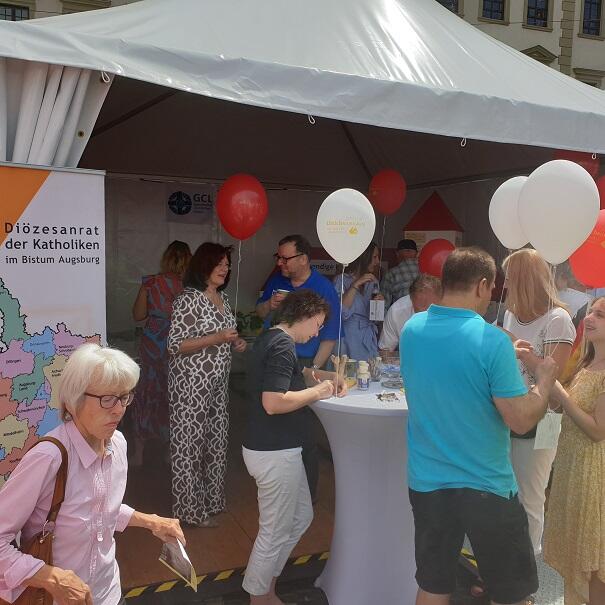 Mit einem bunten Fest auf dem Augsburger Rathausplatz ist am Samstag, den 8. Juli 2023, das Ulrichjubiläumsjahr feierlich eröffnet worden. Unter den rund 40 kirchlichen Einrichtungen, die sich mit diversen Mitmachaktionen für Jung und Alt der Öffentlichkeit präsentierten, war auch der Diözesanrat der Katholiken mit einem Stand vertreten. Unter dem Motto „Lebendige Kirche bauen“ konnten die Besucher ihre Gedanken dazu auf vorbereiteten „Ziegelsteinen“ notieren und an ein Kirchenmodell anpinnen.
