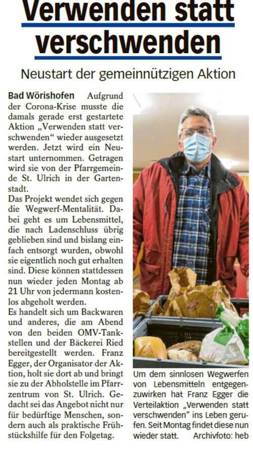 Gestartet wurde die Aktion, die von einer gezielten Öffentlichkeitsarbeit begleitet und durch Sponsoren – einer Bäckerei und zwei Tankstellen – unterstützt wurde, im April 2020; damals gab es erste Überlegungen zur Umsetzung. Richtig losgehen konnte es wegen der Pandemie aber erst im September 2020. Ab diesem Monat wurden Lebensmittel, die nach Ladenschluss übriggeblieben waren und bislang einfach entsorgt wurden, „gerettet“ und einmal wöchentlich im Pfarrzentrum von St. Ulrich ausgegeben. Wie Rückmeldungen verdeutlichten, wurden dadurch viele Mitmenschen für die Problematik unserer Wegwerf-Gesellschaft sensibilisiert. Seit Oktober 2021 werden die „geretteten“ Lebensmittel sogar zwei Mal wöchentlich ausgegeben.
