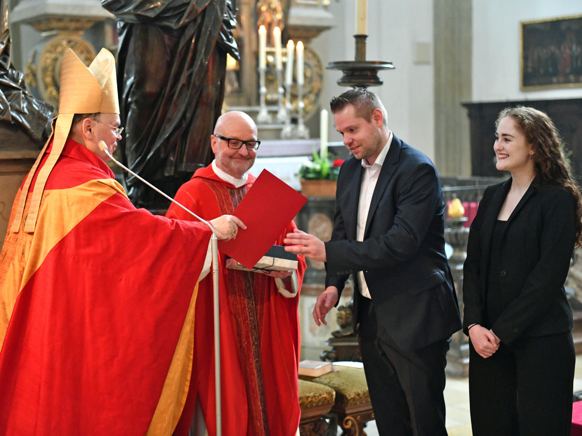 Am Ende des musikalisch-festlichen Gottesdienstes überreichten Bischof Bertram und der Leiter des Amts für Kirchenmusik, der Pramonstratenserpater Stefan Kling als Zeichen der Anerkennung dem Sieger des Kompositionswettbewerbs Jens Klimek eine Urkunde, ein Ulrichskreuz sowie den Ausstellungskatalog der aktuellen Sonderausstellung im Diözesanmuseum. Der Bischof äußerte speziell für diesen Gottesdienst, aber auch für alle weiteren liturgischen Feiern, in denen das Werk landauf landab in Zukunft ertönen wird, einen besonderen Wunsch: „Lassen wir uns anrühren von den Stimmen und Klängen und hören wir sie ‚mit dem Ohr des Herzens‛.“