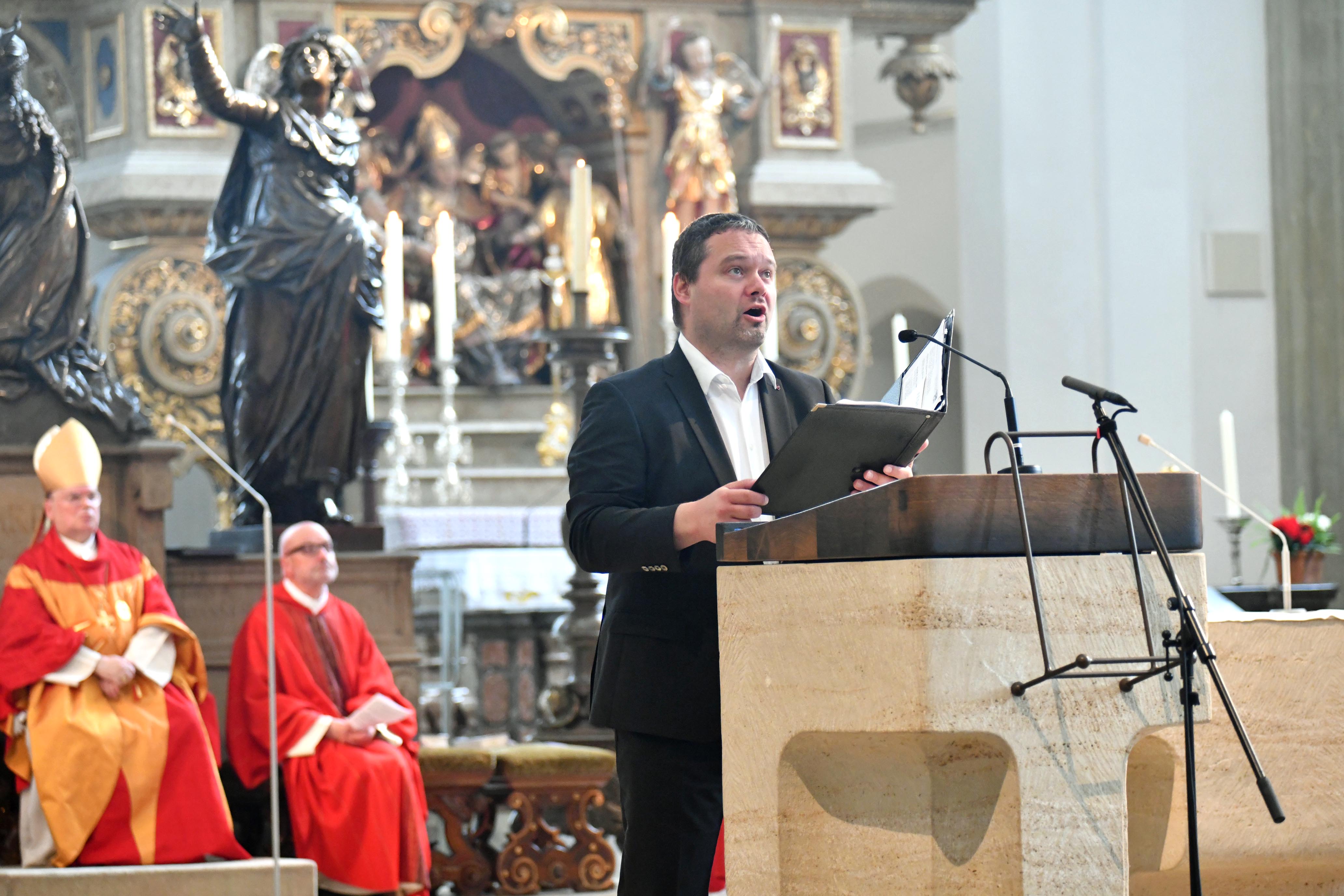 Ein musikalischer Akzent am Hochfest der Apostel Petrus und Paulus, der ganz im Zeichen des Ulrichsjubiläums und der nahenden Ulrichswoche stand: So erklang die preisgekrönte St. Ulrichsmesse des aus dem Harz stammenden Komponisten Jens Klimek an diesem Samstagnachmittag in der Ulrichsbasilika „zum ersten Mal zur Ehre Gottes und seiner Heiligen und zur Freude und Erbauung von uns allen“, wie Bischof Bertram den freudigen Anlass auf den Punkt brachte. Als Zeichen der Anerkennung und Dankbarkeit bekam der Preisträger neben lobenden Worten auch ein Erinnerungsstück an den Namensgeber der von ihm komponierten Messe überreicht.