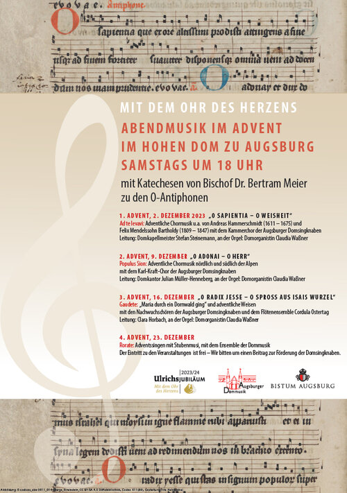 Augsburg (pba). Gesprochenes und gesungenes geistliches Wort prägen in dieser Adventszeit wieder die Konzertreihe „Cantate Domino“ im Hohen Dom zu Augsburg. Umrahmt von adventlichen Motetten und Liedern der Augsburger Dommusik wird Bischof Bertram am Samstagabend um 18 Uhr die zweite Katechese zu den sogenannten O-Antiphonen aus dem Stundengebet der Kirche halten. Die Adventskatechesen sind auch gedruckt in der „Augsburger Schriftenreihe“ (Nr. 71) des Sankt Ulrich Verlages erhältlich.