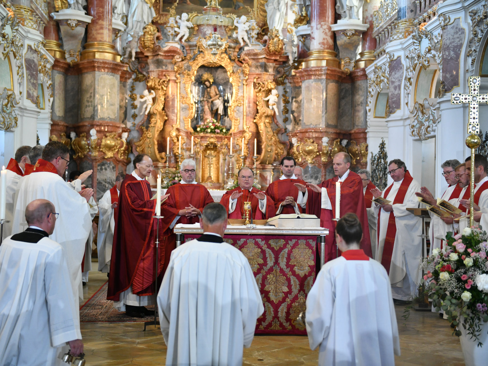 Wer zur Gemeinschaft Christi zählen wolle, dürfe also nicht nur vom Himmel träumen, sondern müsse die „Niederungen der Erde“ ernst nehmen, betonte Bischof Bertram: „Auf diese Weise wird die Kirche zu einer Art Monstranz Jesu Christi, der unser ganzes Menschsein geteilt hat.“ Viele Menschen verließen nach der inneren Auseinandersetzung mit dem Gegeißelten Heiland die Wieskirche anders, als sie hineingegangen waren. Bei manchen habe sie sogar ihre eigentliche Berufung entdeckt, sei es zum Priester- und Diakonentum, zum Ordensleben oder als Laien in den Familien oder der Kirche. Das Unterstützen der Berufungen sei auch etwas, was sein Wirken als Bischof besonders begleite: „Der eigentliche Schatz unserer Diözese sind Menschen, die den Spuren Jesu folgen wollen.“