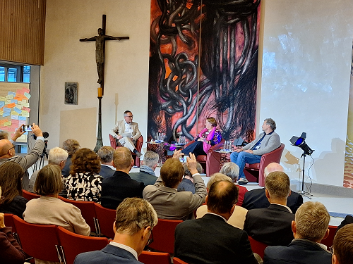 Der Nachmittag startete mit Gesprächsrunden in den verschiedenen Gruppierungen und öffnete sich anschließend in einer Poster-Session im Foyer, bei der gezielt Ansprechpersonen aufgesucht werden konnten. Für den Diözesanrat Augsburg waren mehrere Vorstandsmitglieder vor Ort. Erfrischend als Videoeinspielung meldeten sich schließlich Kardinal Reinhard Marx und die Bayerische Staatsministerin für Unterricht und Kultur Anna Stolz sowie sechs weitere Personen des öffentlichen Lebens mit kurzen Thesen und Erläuterungen zu Wort: „Kirche braucht Bildung“, „Bildung braucht Gott“, „Staat und Kirche brauchen einander“, hieß es unter anderem.