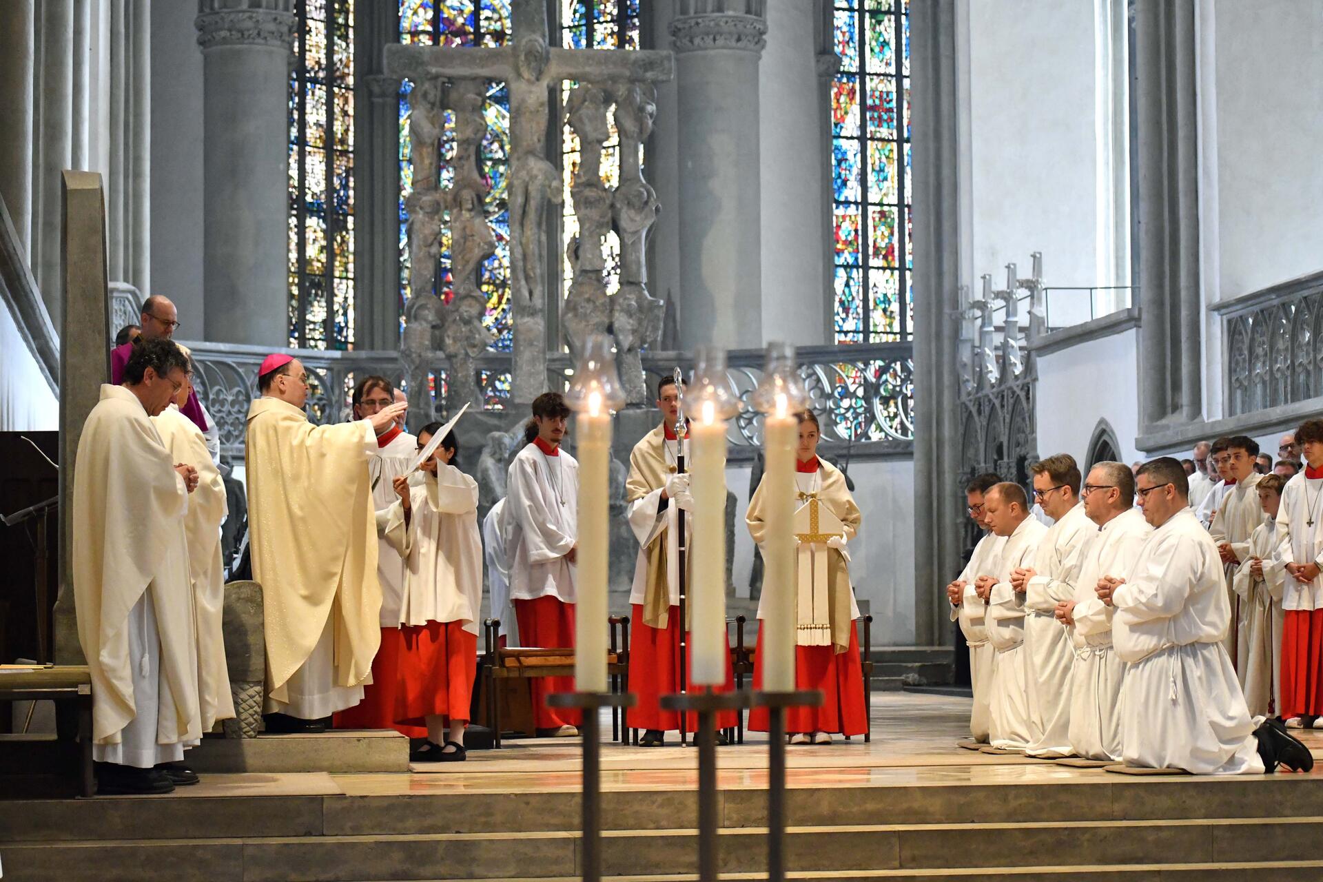 Auch die Ehefrauen der Weihekandidaten bestätigten während der Weiheliturgie mit ihrem „Ich bin bereit“ die Frage des Bischofs nach der Bereitschaft, ihre Ehemänner bei deren Dienst zu unterstützen. Schon in seiner Predigt brachte Bischof Bertram den anwesenden Frauen sowie Familienangehörigen und Freunden gegenüber seine Wertschätzung zum Ausdruck: „Danke, dass Sie den mutigen Weg der künftigen Diakone mitgehen und Ihnen den Rücken stärken. Sie unterstützen Menschen, die nicht primär verdienen, sondern dienen wollen. Das ist heute nicht selbstverständlich. Seien Sie stolz darauf!“