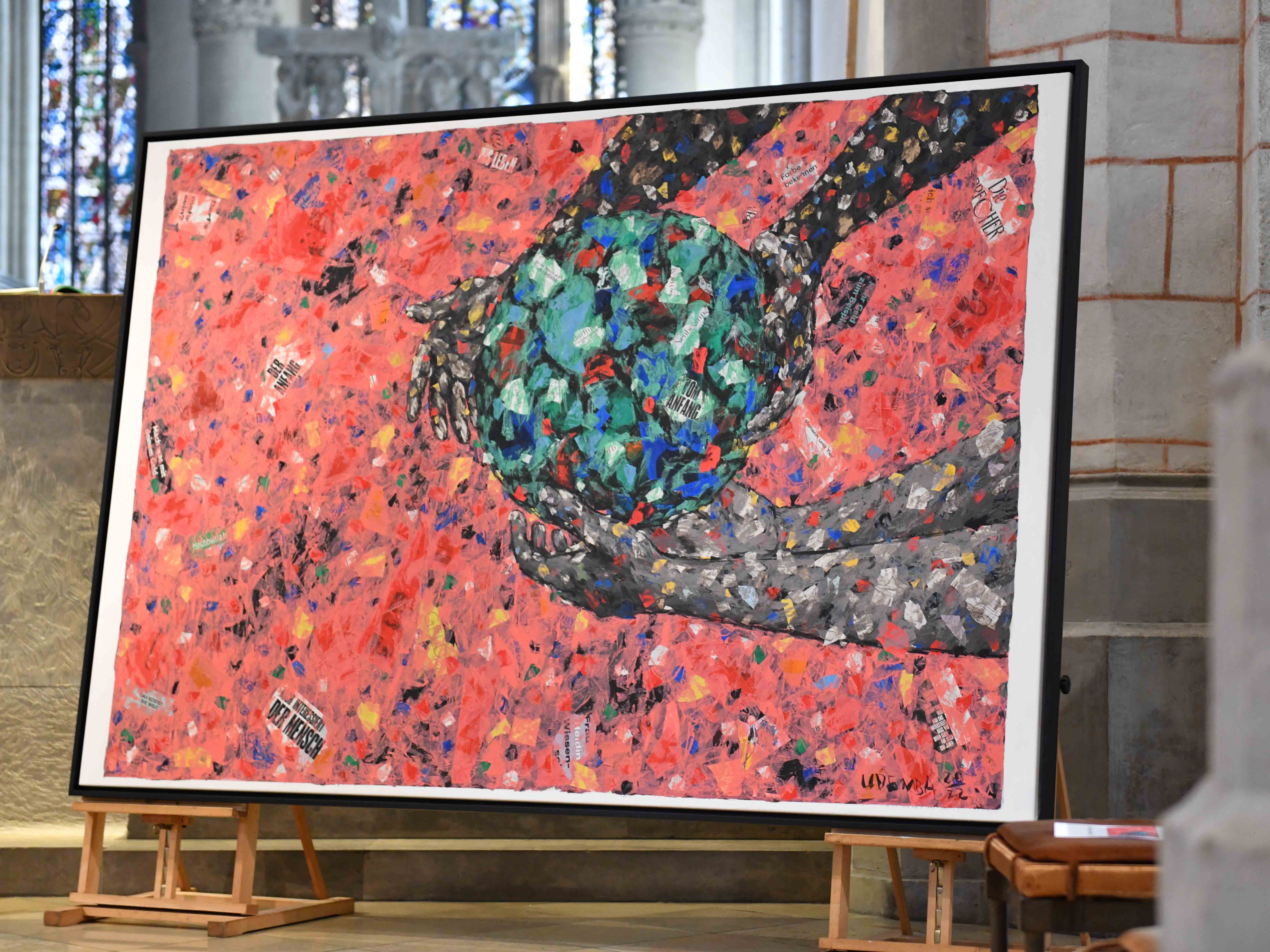 Auf dem farbenprächtigen Gemälde sind vier Hände zu sehen, die vor leuchtend rotem Hintergrund gemeinsam eine blaue Erdkugel halten. Der Titel des Bildes lautet „Was ist uns heilig?“: „Die Frage soll dazu einladen, über Bereiche nachzudenken, die uns Menschen wichtig sind: Gibt es noch Tabus? Gibt es Bereiche, die wir nicht antasten?“, erinnerte Udemba an die Bedeutung und Notwendigkeit menschlicher Demut. Wie wichtig ihm neben ästhetischen Aspekten auch eine klare Botschaft bei seinen Werken ist, zeigt sich nicht zuletzt in seiner künstlerischen Handschrift und Technik: in Form einer Collage verwebt er Zeitungsschnipsel, die ein mehrdimensionales Bild zu erschaffen suchen. „Ich verwende für meine Bilder Zeitungen, weil sie Träger von Informationen sind und Botschaften übermitteln. Ich will die Komplexität und Vielschichtigkeit unserer Welt aufzeigen“, so der Künstler.