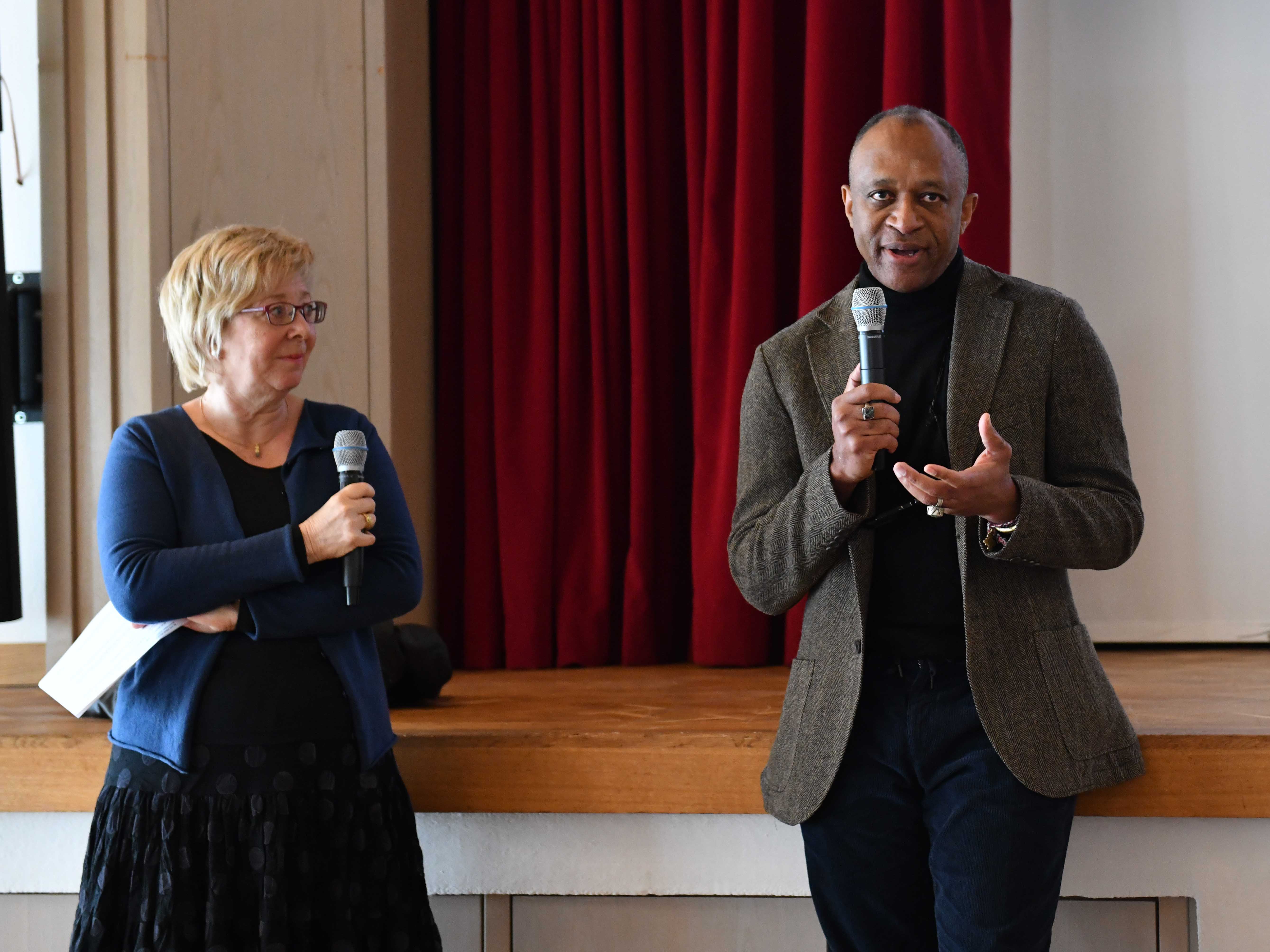 Im Anschluss an den feierlichen Gottesdienst waren Künstlerinnen und Künstler zu einem Vortrag über das diesjährige Misereor-Hungertuch in den Kolpingsaal eingeladen. Zusammen mit der Misereor-Referentin Dr. Claudia Kolletzki stellte der nigerianische Künstler Emeka Udemba sein Gemälde näher vor, das sich anlässlich der bundesweiten Eröffnung der Misereor-Fastenaktion derzeit in Augsburg befindet.