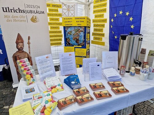 Die Idee, sich an den Augsburger Europawochen zu beteiligen, wurde im Sachausschuss „Europa und Welt“ des Diözesanrates der Katholiken im Bistum Augsburg zu Jahresbeginn geboren. Die Sachausschussleiterin Manuela Jocham erklärt: „Von kirchlicher Seite gibt es viele weltkirchliche Initiativen und Partnerschaften, jedoch wenige, die sich auf Europa beziehen. Das wollen wir ändern“. Ihre Motivation ziehen sie und ihre Diözesanratskolleginnen und –kollegen aus einem christlichen Werteverständnis, das die Europäische Einheit entscheidend prägte und auch in Zukunft leitend sein soll. Im Reigen der Standauftritte zwischen politischen Parteien präsentierten sich die Christinnen und Christen daher selbstbewusst und zugewandt. Neben Kaffee und Keksen gab es die „Träume für Europa“ von Papst Franziskus, das Ottobeurer Europamanifest, das Bischof Bertram kürzlich im dortigen Benediktinerkloster mitunterzeichnet hatte, und den gemeinsamen Wahlaufruf vom Bischof und der Diözesanratsvorsitzenden Hildegard Schütz für den Wahltag des 09. Juni zu entdecken. Gebete und Karten der Pfingstaktion des katholischen Hilfswerks Renovabis rundeten das Angebot ab. Unweit auf der Bühne erfreuten die tschechischen Sängerinnen und Sänger des Schulchors der Partnerdiözese Königgrätz mit musikalischen Beiträgen das interessierte Publikum auf dem belebten Platz im Zentrum der Stadt.