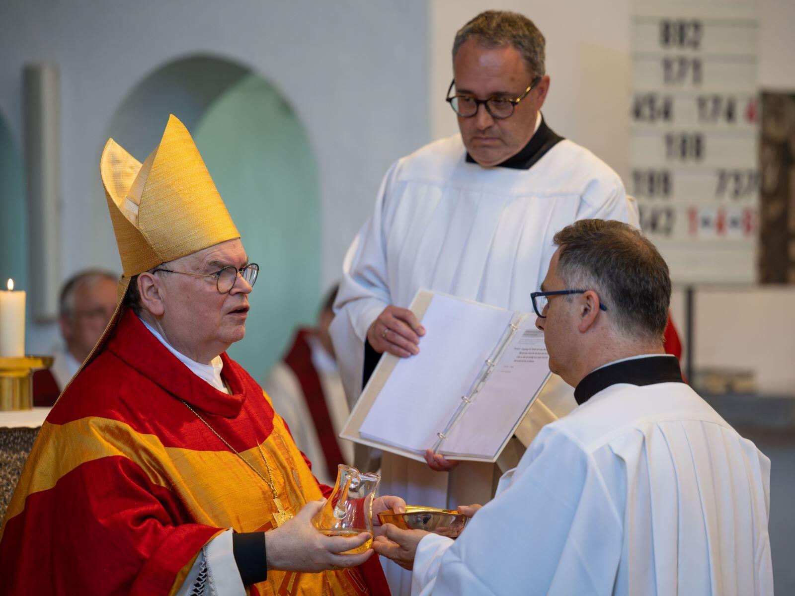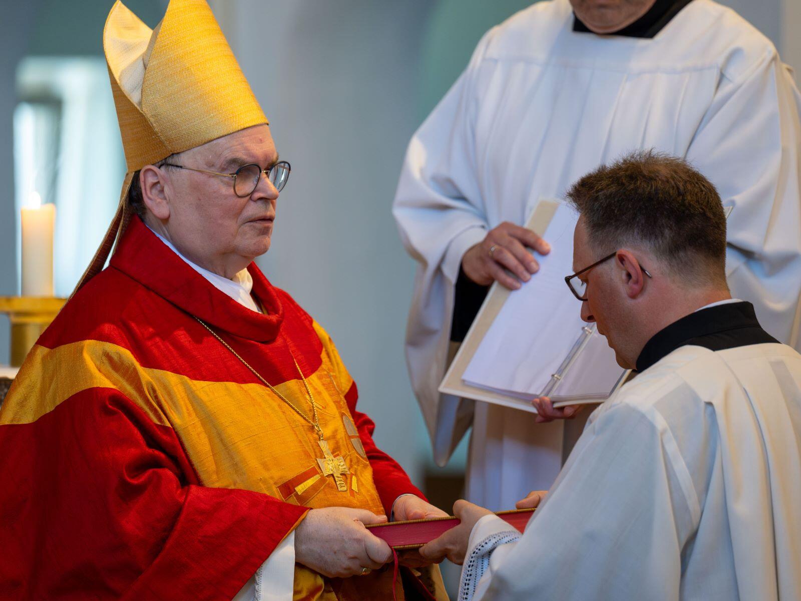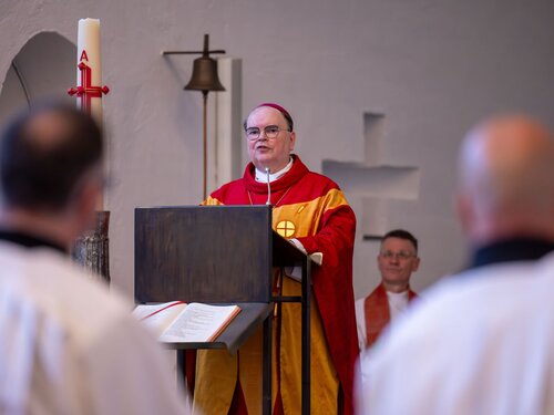 In seiner Predigt nahm der Bischof dabei Bezug auf seinen eigenen Primizspruch „Unverkennbar seid ihr ein Brief Christi, geschrieben nicht mit Tinte, sondern durch das Wirken des lebendigen Gottes“ (2 Kor 3,3), den er sich in Vorbereitung auf seine Priesterweihe vor genau vierzig Jahren ausgesucht hatte. Ein „Brief Christi“ zu sein heiße dabei, die Botschaft Gottes in die Welt hinauszutragen und gleichsam eine „Visitenkarte“ für ihn und sein Wirken in der Welt sein. „Wer auf Sie trifft, soll spüren, dass er an einer guten Adresse ist“, betonte der Bischof und zitierte aus einem selbstverfassten Gedicht, dass er während der letzten Exerzitien vor der Priesterweihe niederschrieb: „Mein Herr und mein Gott, ich will dein Brief sein. Kein trockener Geschäftsbrief, keine wohlklingenden und zugleich leeren Worte, sondern ein Liebesbrief, der den Menschen Treue und Trost zuspricht, ein Brief, geschrieben nicht mit Tinte, sondern durch das Wirken des Heiligen Geistes. Lass mich dein Brief sein, ohne jemals das Gefühl zu haben, im Leben etwas zu versäumen.“