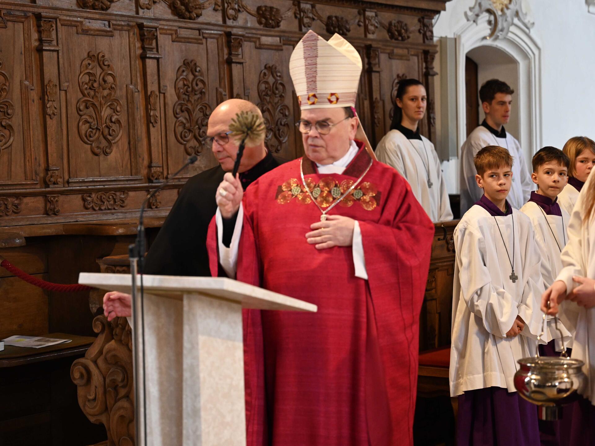 Seit Jahrhunderten kämen Menschen nach Violau, um die Nähe Gottes zu suchen und Kraft im Glauben zu finden, stellte Bischof Bertram am Beginn seiner Predigt im Rahmen des Pontifikalgottesdienstes in der Wallfahrtskirche fest. Von zentraler Bedeutung seien dabei künftig der neue „Tisch des Wortes“ und der neue „Tisch des Brotes“, also Altar und Ambo. Beide würden sich hervorragend in das Gesamtbild des Altarraums einfügen.
