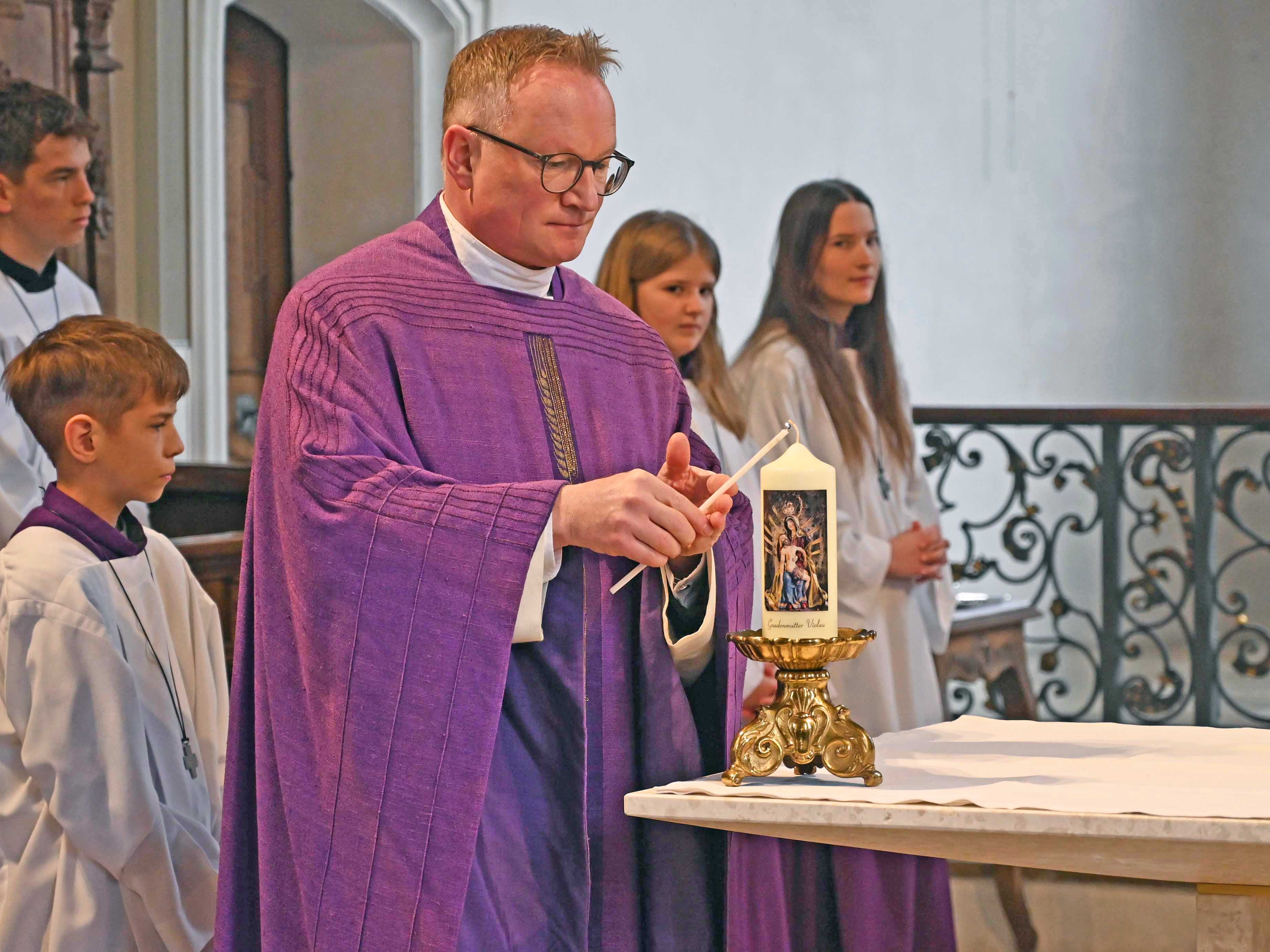 Im Rahmen eines feierlichen Pontifikalamtes am 4. Fastensonntag wurden in Violau der neue Altar und ein neuer Ambo durch Bischof Dr. Bertram Meier geweiht. Die durch den Waaler Künstler Thomas Link gestalteten Objekte bilden fortan als „Tisch des Brotes“ und „Tisch des Wortes“ das liturgische Zentrum der Rokoko-Kirche, die seit über 500 Jahren das Ziel zahlreicher Wallfahrten ist.