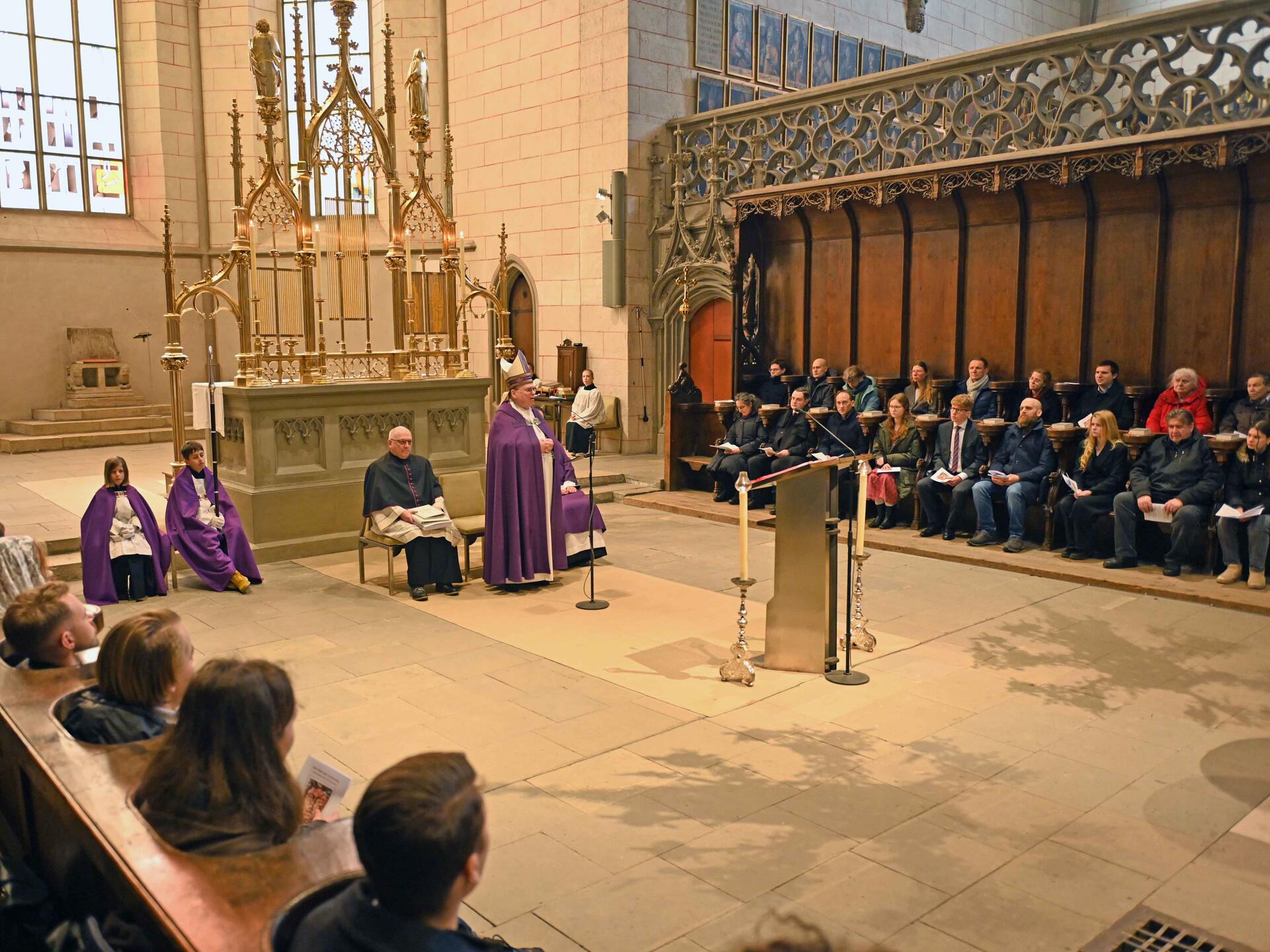 Christen seien aber auch daran zu erkennen, dass sie füreinander beten würden, weshalb auch die Feier am Ersten Fastensonntag bewusst in der Bischofskirche stattfinde. Mit einbezogen in das Gebet wurden daher auch ausdrücklich die Katechumenen, die nicht vor Ort anwesend sein konnten. Ganz besonders empfahl Bischof Bertram die Eucharistische Anbetung, die vielerorts sogar rund um die Uhr gepflegt werde. Sein abschließender Wunsch lautete: „Strecken Sie sich nach dem aus, der unser Freund, Meister und Lehrer sein will.“