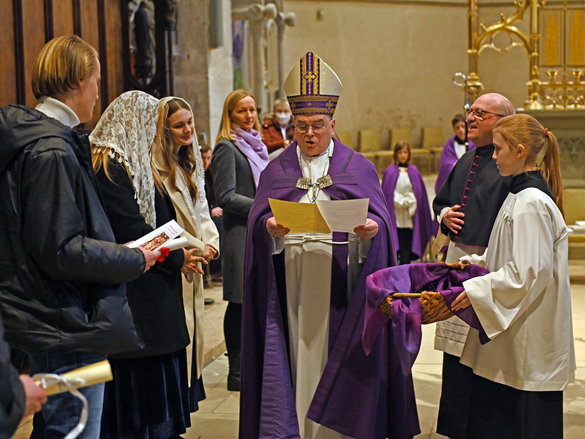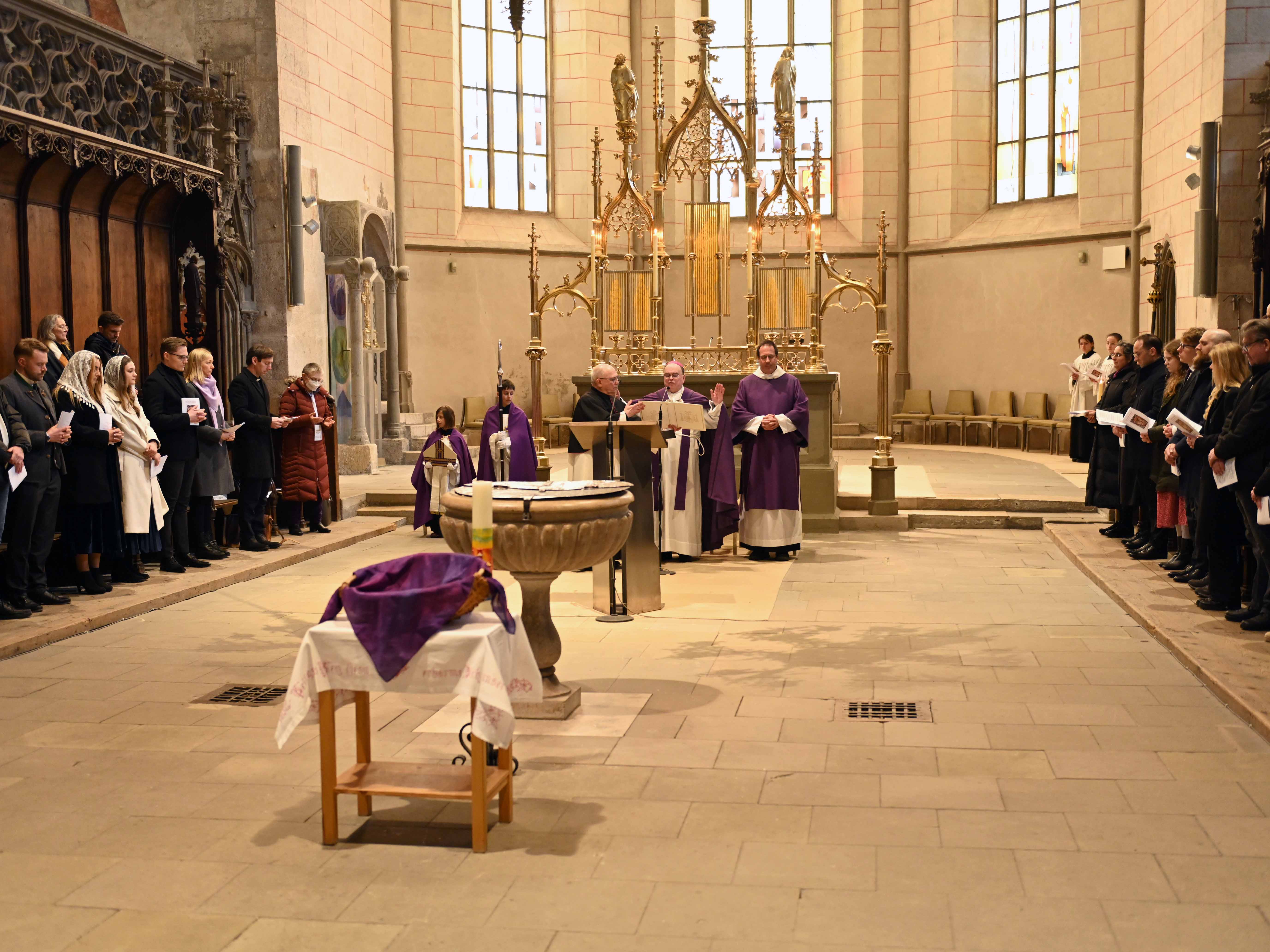 Am 1. Fastensonntag hat Bischof Dr. Bertram Meier im Rahmen einer Wortgottesfeier im Westchor des Domes 17 Männer und Frauen für den Empfang der Sakramente zugelassen. Diese wurden dabei von ihren Familien sowie den zuständigen Seelsorgerinnen und Seelsorgern vor Ort begleitet. Beeindruckende Glaubenszeugnisse gaben Einblicke in einen Prozess, an dessen Ende für 13 von ihnen die Taufe und für vier die Firmung steht.