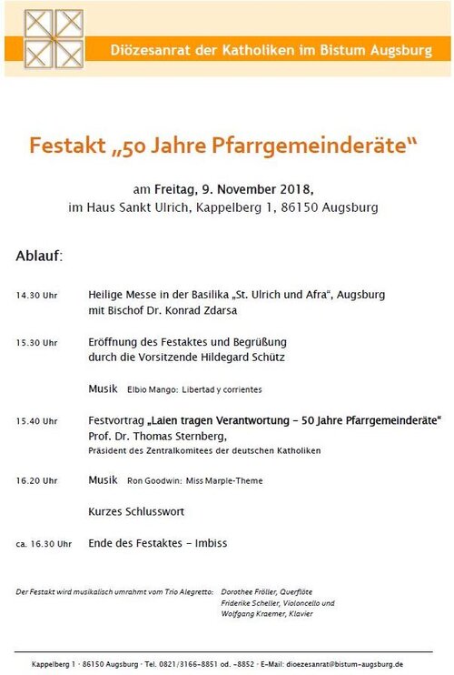 Die konstituierende Sitzung des Diözesanrats beginnt üblicherweise am Freitag mit dem Bericht über die vorhergehende Amtsperiode, der Entlastung des Vorstands und der Verabschiedung der scheidenden Mitglieder. Dieses Jahr findet zusätzlich am Freitag, den 9. November 2018, ein Festakt „50 Jahre Pfarrgemeinderäte“ statt, zu dem alle Mitglieder der Pfarrgemeinderäte und der Dekanatsräte herzlich eingeladen sind. Wie immer beginnt die Vollversammlung mit einer heiligen Messe, diesmal bereits um 14.30 Uhr in der Ulrichsbasilika, zelebriert von Bischof Dr. Konrad Zdarsa. Der Festakt selbst beginnt um 15.30 Uhr und wird auch musikalisch begleitet werden. Den Festvortrag wird der Präsident des Zentralkomitees der deutschen Katholiken, Prof. Dr. Thomas Sternberg, zum Thema „Laien tragen Verantwortung – 50 Jahre Pfarrgemeinderäte“ halten.
