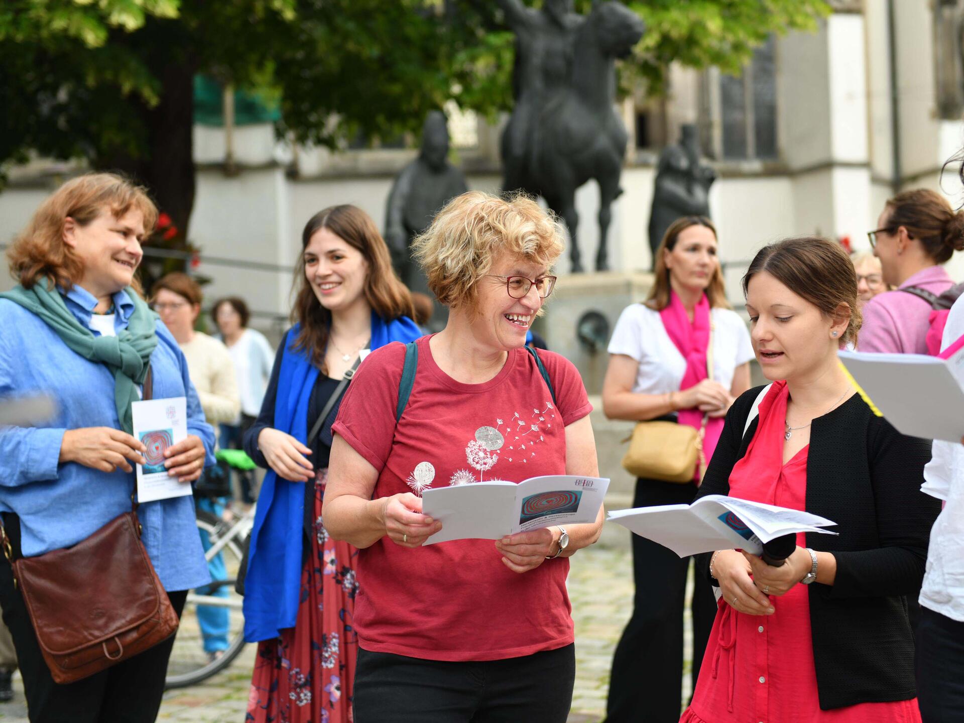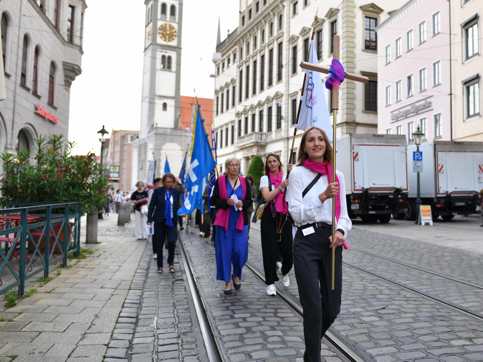 Vereint im Gebet um den Frieden haben sich an diesem Mittwoch knapp 300 Frauen in den frühen Morgenstunden auf den Weg vom Dom über die Maxstraße bis hin zur Basilika St. Ulrich und Afra gemacht. Mit dem Wegkreuz und blauen Verbandsfahnen voraus gingen sie singend und betend den rund eineinhalb Kilometer langen Wallfahrtsweg. Nach einem feierlichen Empfang mit Glocken und Orgelklängen rundete ein Pontifikalamt mit Bischof Dr. Bertram Meier die traditionelle Frauenwallfahrt in der Ulrichswoche ab.