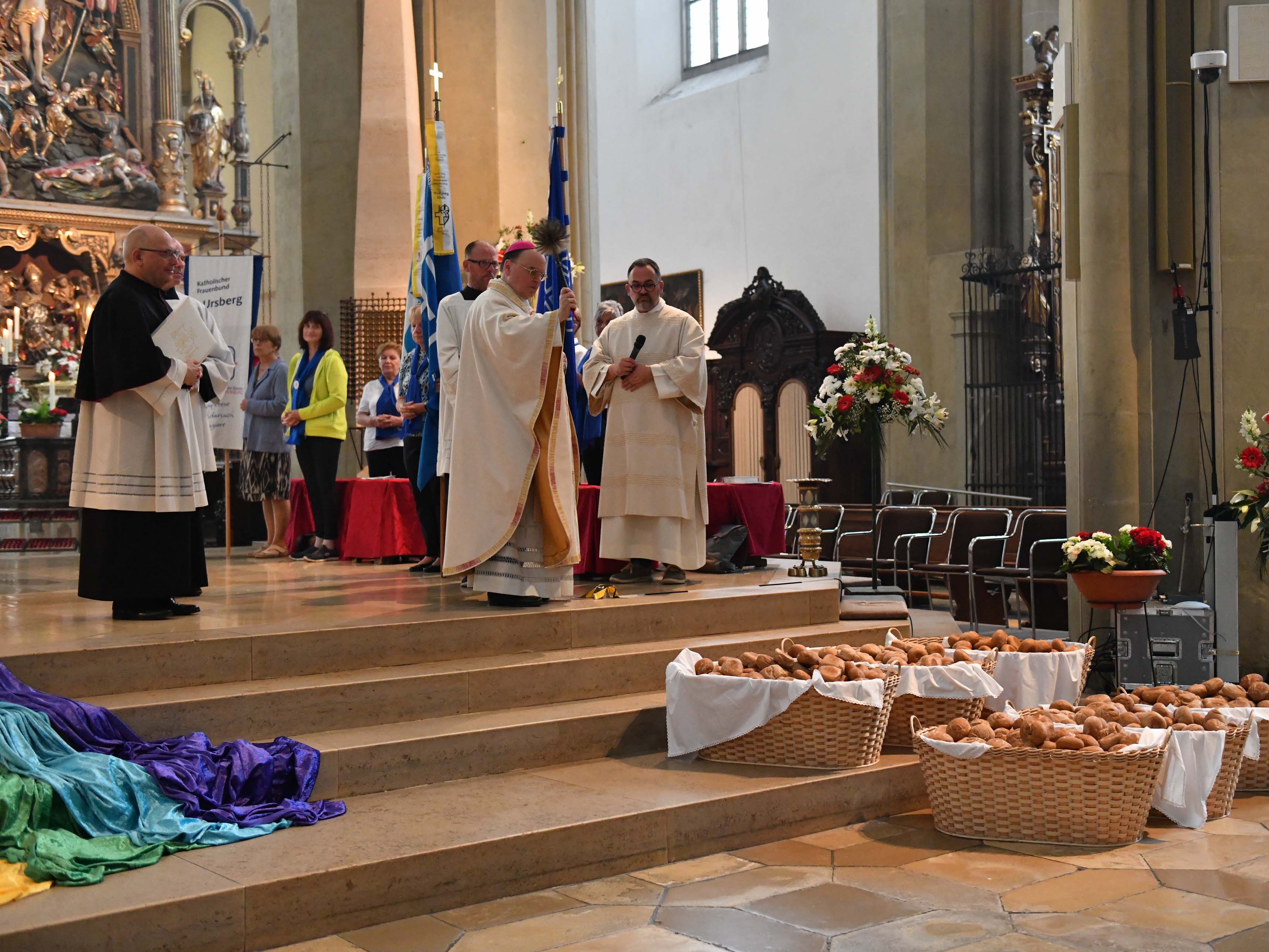 Der Tradition entsprechend standen in großen, geschmückten Körben auch heuer wieder die Ulrichsbrote vor dem Altar. Die Semmeln erinnern noch heute an die Ursprünge der Wallfahrt im Jahr 1947, die bereits damals geprägt war vom Gebet um den Frieden. Am Ende der Messe segnete Bischof Bertram die Brote, bevor sie gegen eine Spende an die Frauen verteilt wurden und beim anschließenden gemeinsamen Frühstück im Haus St. Ulrich auf den Tisch kamen. Der Erlös der Ulrichsbrote kommt Menschen in der Ukraine sowie der Pfarreiengemeinschaft Ulrich und Afra zugute.