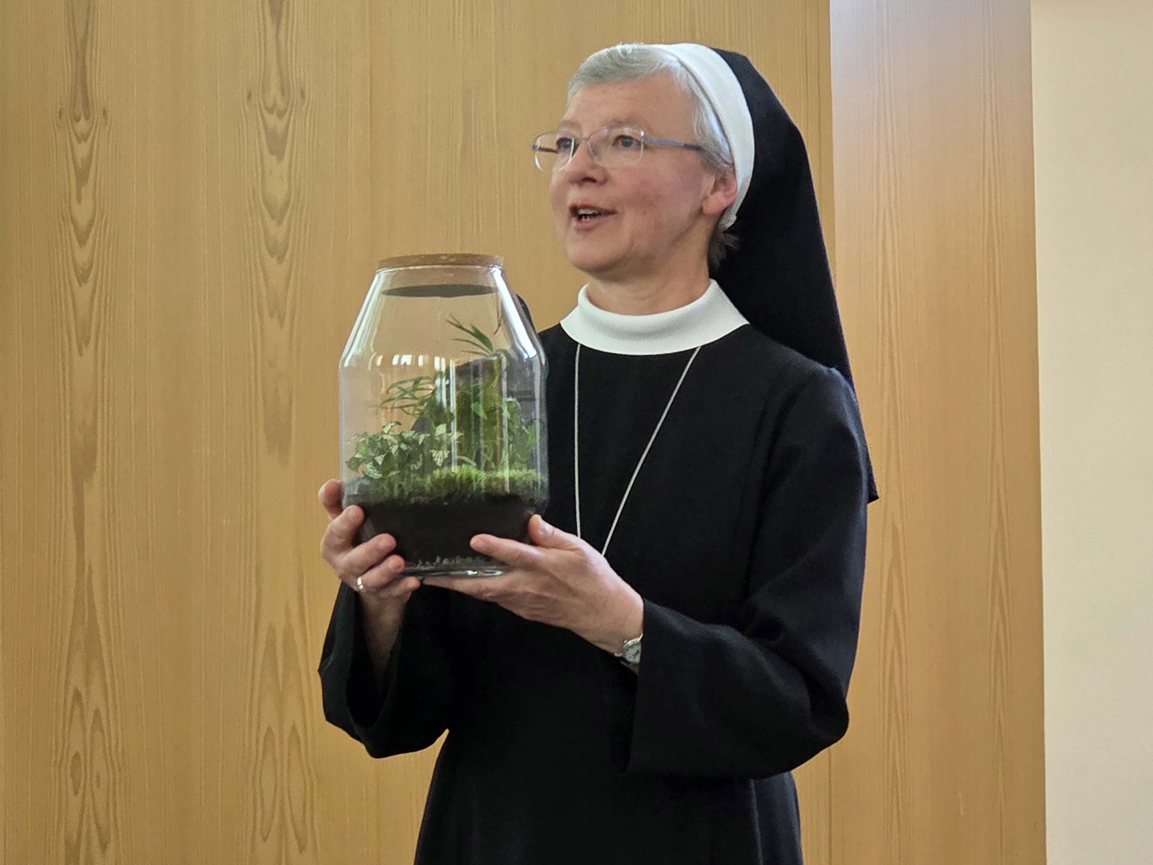 Der Vormittag stand im Zeichen des Franziskusjubiläums. Sr. Martha Lang OSF vom Crescentiakloster Kaufbeuren lud daher zu franziskanischen Impulsen anlässlich des 800. Todestages von Franz von Assisi ein. Sie machte deutlich, dass es darum geht, den Spuren Jesu zu folgen: Franziskus habe Impulse hinterlassen, wie dies geschehen könne, doch jede und jeder müsse für sich schauen, wie seine persönliche Nachfolge möglich ist und geschehen kann. Anhand verschiedener Lebensstationen des Heiligen zeigte die Referentin auf, wie Franziskus durch sein Verhalten und Tun zum Vorbild werden könne: Sein Einsatz zur Erneuerung der Kirche, das Leben im Einklang mit der Schöpfung, seine Friedensinitiative in der Begegnung mit dem muslimischen Sultan bis hin zum Empfang der Wundmale. Die lebenslange Betrachtung des Gekreuzigten hätten sich in seinem Leben am Ende körperlich in den Wundmalen gezeigt. Franziskus habe wahrgenommen, gelobt, gedankt und vertraut (Sonnengesang) bis zur Begegnung mit dem Bruder Tod.