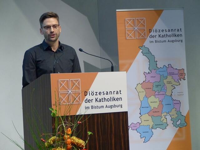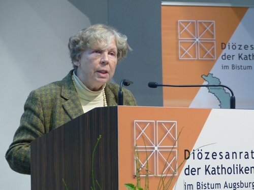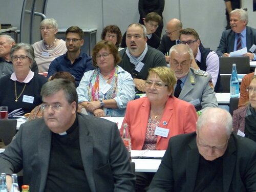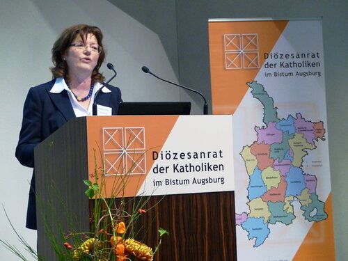 Auch der Bericht der Diözesanratsvorsitzenden enthielt erheblich mehr Aspekte, als hier dargestellt werden können. Er befasste sich zunächst mit der weltpolitischen Situation und mit einem Aufruf an die Christen, sich nicht verunsichern oder gar verhetzen zu lassen. Weiters forderte Hildegard Schütz die Vollversammlungsteilnehmer auf, sich gut zu informieren und selbst zu Meinungsmachern zu werden: „Mischen wir uns ein!“ Ein weiterer wichtiger Aspekt ist es, sich nicht damit zu begnügen, Opfer oder gar Täter in der virtuellen Welt zu werden, sondern auf die Menschen zuzugehen, sie ihr Leben und ihre Kultur, ihre Religion und ihre Familien kennen zu lernen. „Seien wir Zeugen in der Welt!“ Als einen herausragenden Zeugen Christi in der Welt zeichnete Hildegard Schütz sodann Papst Franziskus, der uns auffordert, engagierte und unbequeme Europäer zu sein. Dieses Engagement zu fördern, ist auch Anliegen des Konzepts „Kirche und Kommune – gemeinsam für soziale Gemeinden“, für das die Vorsitzende gemeinsam mit Staatsminister a.D. Josef Miller und anderen alle Dekanate besucht. In diesen Netzwerkveranstaltungen möchte der Diözesanrat auch immer wissen, was er für die Ehrenamtlichen tun kann, und es ist ein starkes Bedürfnis nach einer stärkeren Wertschätzung ihrer Arbeit (bis hin zur finanziellen Entschädigung) festzustellen.