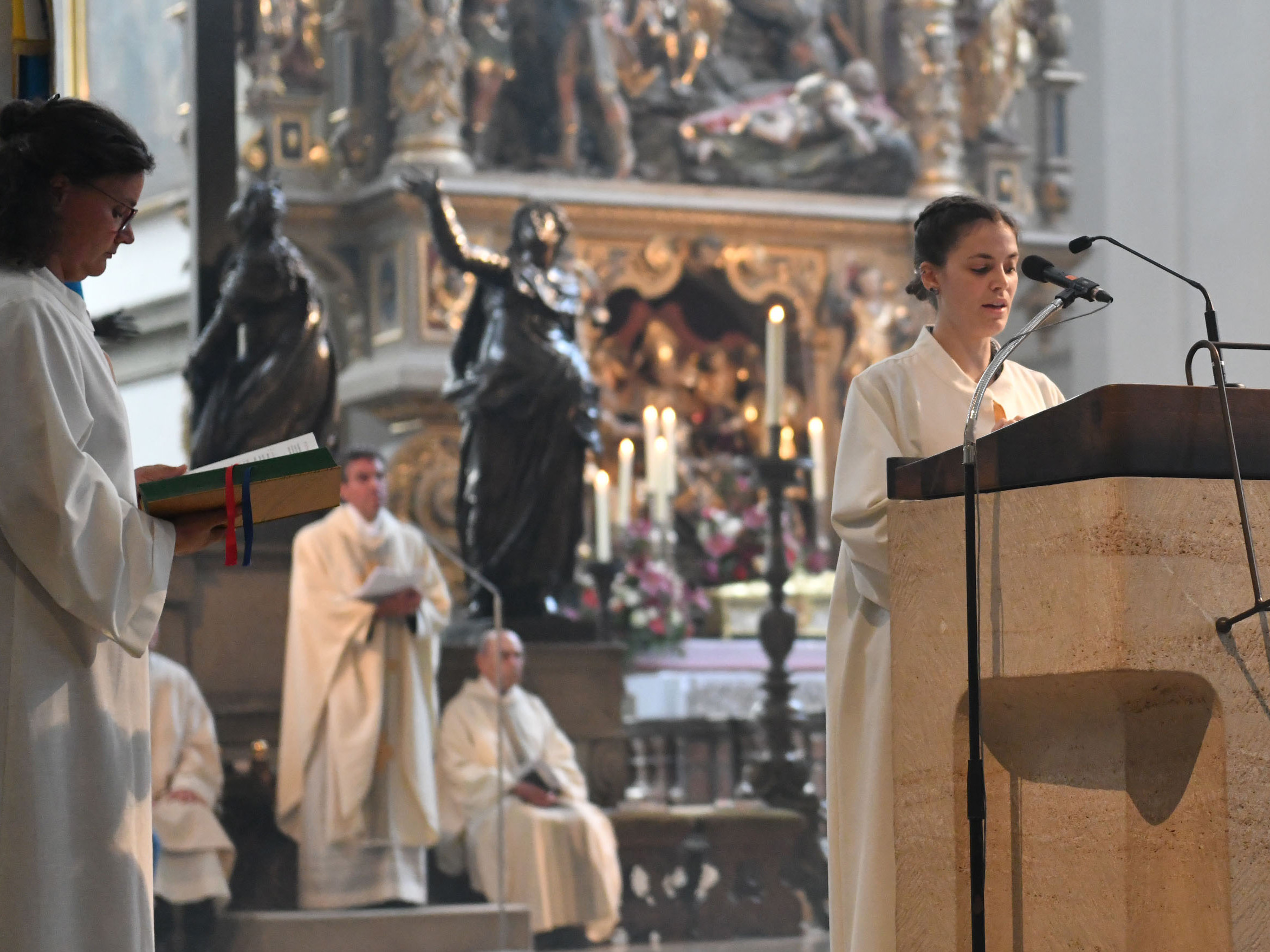 Die Geschichte der Syrophönizierin aus dem gehörten Evangelium war dann auch Ausgangspunkt für die Predigt, die auf zweifache Weise nicht klassisch daherkam. Denn in Dialogform machten sich Abt Johannes Eckert und Ruth Hoffmann gemeinsam auf eine Innenschau der handelnden Personen, sie tauchten abwechselnd ein in die Gefühls- und Gedankenwelt von Jesus und der heidnischen Frau. Was hat Jesus gedacht und was die heidnische Frau aus Syrophönizien? Was hat sie wohl zu ihrem Handeln bewegt und sich in ihrem Denken durch die Begegnung mit dem Anderen verändert? Die Gedankenstücke, die von beiden abwechselnd vorgelesen wurden, legten die Bibelstelle auf eine neue, innovative und zum Nachdenken anregende Weise aus. „Jesus kommt durch den Dialog mit der Frau zu einer tiefen Einsicht und lässt sich durch alle Evangelien hinweg ausschließlich von dieser belehren“, fasst Abt Johannes Eckert als Schlussfolgerung zusammen.