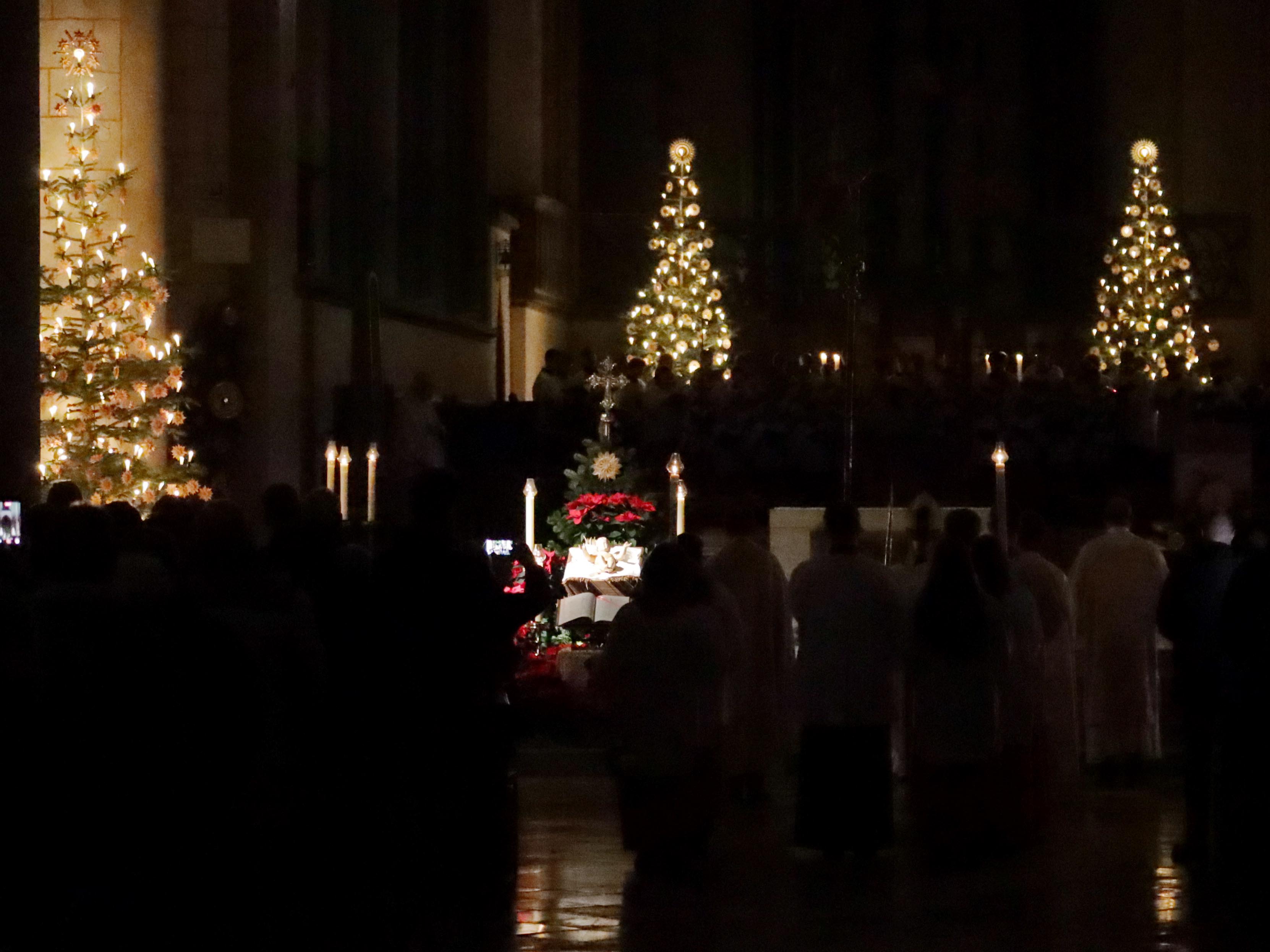 In seiner Predigt zur feierlichen Christmette im Hohen Dom hat Bischof Bertram betont, dass es kein Zufall sei, dass man diese Feier in der Nacht abhalte. So wie Gott durch seine Menschwerdung ein nicht verlöschendes Licht in die Dunkelheit gesetzt habe, gelte es in der Finsternis der eigenen Existenz, das Licht Gottes zu suchen und zu finden. Der Mensch sei stets versucht, sein Glück im Materiellen oder im großen Geld zu suchen, so der Bischof: „Gott ist im Gehen. Weihnachten feiern geht auch ohne Gott. Doch wo wir aufhören, Gott die Ehre zu geben, fangen wir bald an, uns selbst groß aufzuspielen.“ Weihnachten sei ein Zeichen, dass Gott „im Kommen“ und mitten unter uns sei.
