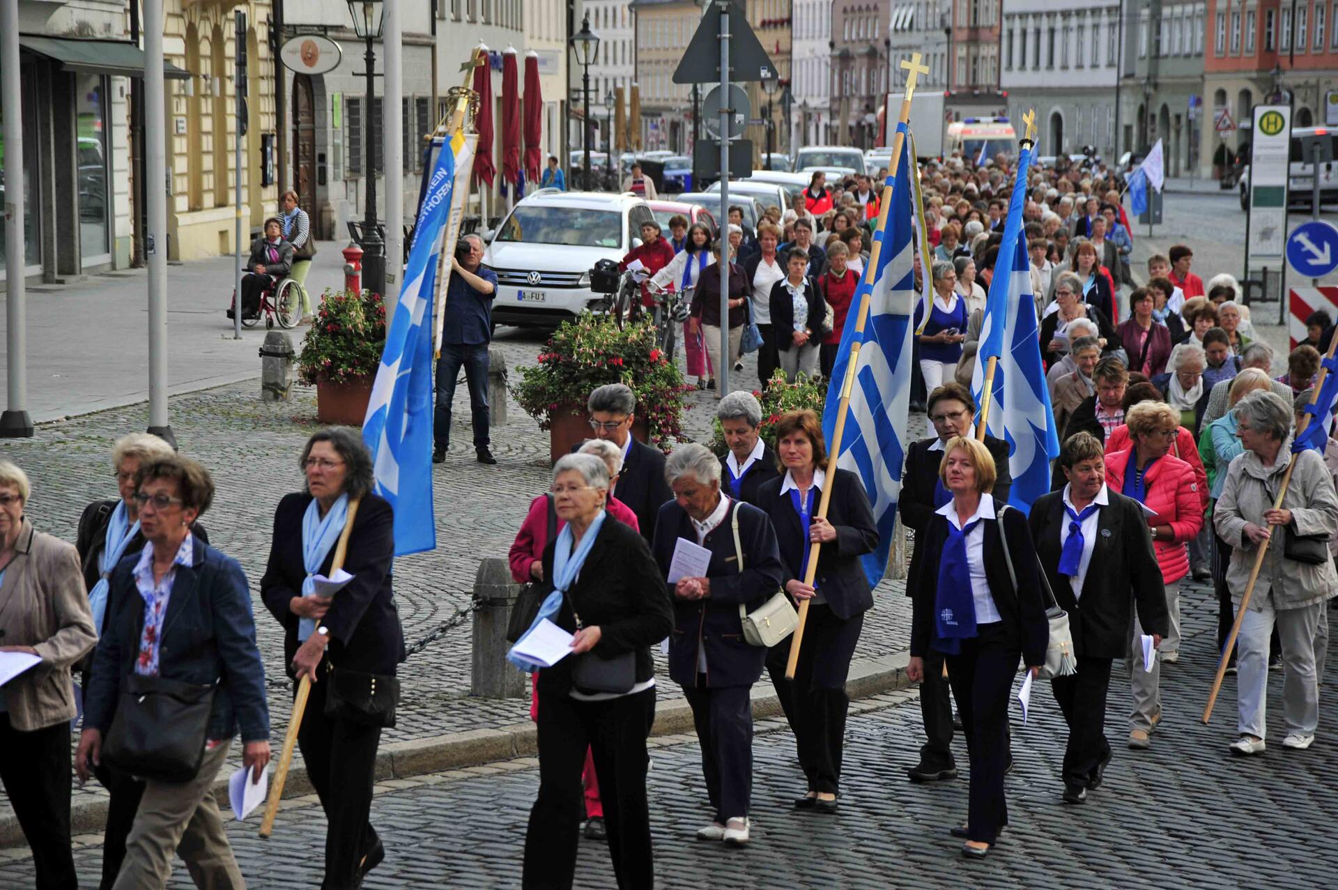 Auch das diesjährige Leitwort der Frauenwallfahrt wurde dahingehend ausgewählt: „Mit dem Herzen sehen“ lautete es. Neben dem Wegkreuz, das den Wallfahrerinnen vorausging, umsäumten auch zahlreiche blaue Fahnen den Pilgerzug. Sie wurden von den Frauen aus den teilnehmenden Zweigvereinen des Katholischen Deutschen Frauenbunds im Bistum Augsburg (KDFB) mitgebracht und getragen.
