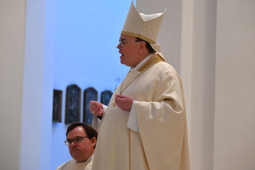 In seiner Predigt erinnerte der Bischof an Zeilen, die sich häufig bei amputierten Kreuzen ohne Arme und Beine fänden, die von dunklen Zeiten, Krisen und Kriegen, von Bedrängnis und unterdrückten Christen Zeugnis ablegten: „Christus hat keine anderen Hände, nur die unseren, um Menschen zu begleiten. Christus hat keine anderen Füße als die unseren, um sich zu den Leuten auf den Weg zu machen. Christus hat kein anderes Herz, nur das unsere, um den Menschen Gotte Freundlichkeit, seine Freundschaft anzubieten.“ Und Bischof Bertram bekräftigte: Christus habe keine anderen Hände, keine anderen Füße, kein anderes Herz, nur das unsere, um seiner Frohen Botschaft Hand, Fuß und Herz zu geben.