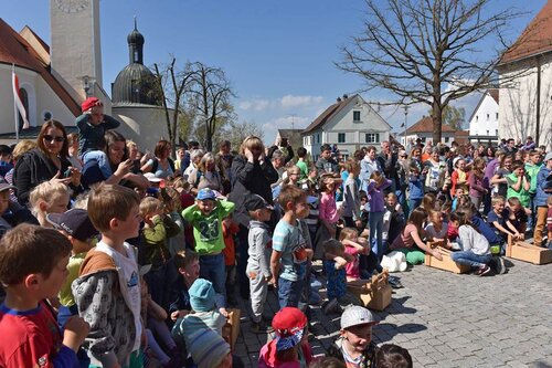 In diesem Jahr geht der Spendenerlös an die Jesuiten in der libanesischen Bekaa-Ebene. Sie arbeiten dort zusammen mit geflohenen syrischen Lehrern daran, das Bildungsdefizit der Flüchtlingskinder auszugleichen. 85 Prozent der Kinder hätten laut Pfarrer Dr. Ulrich Lindl, Hauptabteilungsleiter Kirchliches Leben in der Diözese Augsburg, keinen Zugang zu Bildung. Deshalb haben die Jesuiten drei Schulen für insgesamt 1.300 Schüler zwischen sieben und 15 Jahren eingerichtet. „Wir müssen diese Kinder dazu befähigen, dass sie etwas lernen, um ihr Land, sobald es Frieden gibt, wieder aufzubauen“, so Pfarrer Lindl im Wortgottesdienst.Zur Eröffnung am heutigen Montag kamen 120 Kinder und Jugendliche aus vier Pfarreien, darunter zahlreiche Ministranten, im Pfarrzentrum in Pfaffenhofen zusammen. Im Wortgottesdienst beschrieb Dr. Ulrich Lindl die Bedeutung der Rätschaktion für die Pfarreien, aber auch für die aktion hoffnung. In Bezug auf das diesjährige Projekt sagte er zu den Kindern und Jugendlichen: „Ich denke, wir dürfen diese Kinder im Libanon nicht alleine lassen.“ Er betonte besonders: „Der Lärm der Rätschen soll nicht nur dazu da sein, dass zum Gottesdienst gerufen wird, sondern wachrütteln über die Ungerechtigkeiten dieser Welt.“Während des Gottesdienstes erklärte Michael Mayer aus Beuren, wie eine solche Rätsche aufgebaut ist. Der vierzehnjährige Hobbyschreiner hat zusammen mit einem Freund sechs solcher Rätschen für seine Ministrantengruppe gebaut. Er und die langjährige Oberministrantin Natalie Sluka hatten dafür gesorgt, dass die Eröffnungsveranstaltung der Aktion in diesem Jahr in ihre Pfarrei kam. Im Anschluss informierten sich die Anwesenden in den vier Workshops unter anderem über den Libanon und das Hilfsprojekt. Außerdem gab es ein Quiz über die Karwoche und die Rätschaktion sowie die Möglichkeit für die Teilnehmer, sich kreativ zu betätigen, indem sie ein Plakat mit Fingerfarben gestalteten.Um kurz vor zwölf zogen die Kinder und Jugendlichen dann vom Pfarrheim auf den Rathausplatz. Dort stand bereits die wohl größte Rätsche der Welt. Sie ist fast doppelt so groß wie ein Klavier und wiegt 230 Kilogramm. Zu den Ministrantinnen und Ministranten stießen viele weitere Bewohner des Ortes. Die Organisatoren verteilten Rätschen in verschiedenen Formen und Größen. Um Punkt zwölf Uhr legten sie dann los und beschallten für mehrere Minuten den kompletten Ortskern mit ihrem lauten Krachen.