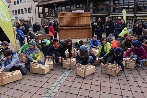Neuburg an der Donau (pba). Um Punkt 12 Uhr schepperte und krachte es heute auf dem Schrannenplatz in Neuburg an der Donau. Mehr als 60 Ministrantinnen und Ministranten aus den Pfarreiengemeinschaften Neuburg und Burgheim hatten sich versammelt, um stellvertretend für das ganze Bistum die diözesane Rätschaktion zu eröffnen. Unter dem Motto „Krach machen für die Eine Welt“ ziehen am Karfreitag und Karsamstag wieder in zahlreichen Pfarreien Ministrantinnen und Ministranten mit ihren Rätschen durch die Straßen und sammeln Geld, das zur Hälfte einem Eine-Welt-Projekt zugutekommt. Gleichzeitig übernehmen sie die Funktion der Kirchenglocken, die an diesen beiden Tagen verstummen.