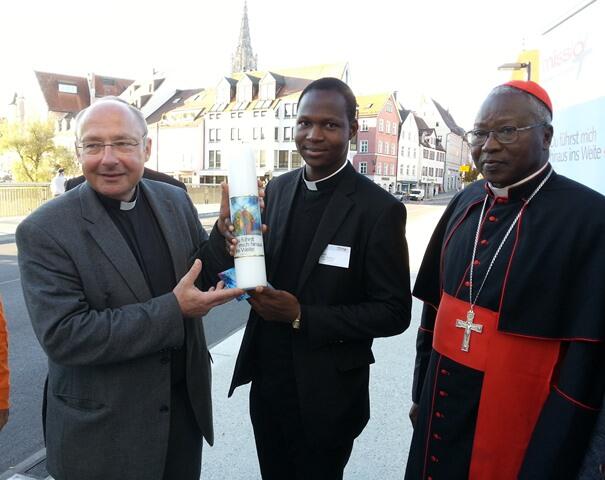 Dekan Ulrich Kloos vom katholischen Dekanat Ulm brachte die missio-Kerze mit, die am 1. Oktober 2017 in Stuttgart zum Start des Monates der Weltmission von Bischof Gebhard Fürst entzündet wurde. Am vergangenen Samstag kam sie in Ulm an und wurde dort auf der Herdbrücke an Pfarrer Dr. Ulrich Lindl von der Abteilung Mission-Entwicklung-Frieden der Diözese überreicht. „Als Christen bauen wir Brücken und keine Mauern. Ein schönes Symbol dafür soll die Übergabe der missio-Kerze auf der Donaubrücke zwsichen den beiden Diözesen Rottenburg-Stuttgart und Augsburg sein“, so Lindl. „Brückenbauer sind unsere missio-Partner aus Burkina Faso, die gerade für 3 Wochen zum Weltmissionsmonat zu Gast in Bayern sind“. Mit dabei waren auf der Herdbrücke auch Kardinal Philippe Ouédraogo und Abbé Felix Ouédraogo aus Burkina Faso, dem diesjähren Beispiel-Partnerland von missio und der Dekan von Neu-Ulm, Markus Mattes. Abbé Felix wird nun die missio-Kerze bis zum 22.10. in einer Schule und verschiedenen Pfarreien in einer „Kerzen-Stafette“ durch die Diözese Augsburg begleiten.