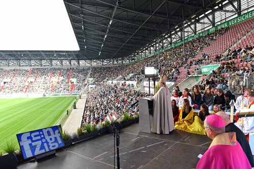 Augsburg (pba). Selbst gestaltete Schulbanner im Wind, jugendliches Stimmengewirr und erwartungsvolle Gesichter: Die Freude auf ein Heimspiel der besonderen Art war in der in weiten Teilen voll besetzten WWK Arena in Augsburg regelrecht zu spüren. Wo sonst die Fußballprofis des FCA angefeuert und bejubelt werden, wehte an diesem Freitag ein anderer Teamgeist durch die Ränge – der Geist der gesamten Schulfamilie des Schulwerks der Diözese Augsburg. Mehr als 20.000 Schülerinnen und Schüler sowie rund 2.300 Mitarbeitende aus 46 Schulen waren zur großen Geburtstagsfeier des Schulträgers aus allen Teilen des Bistums gekommen.